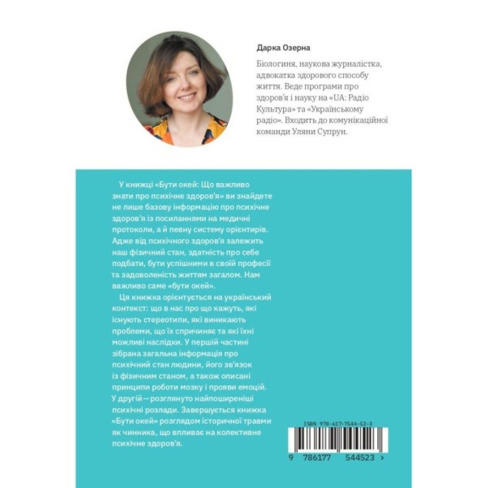 У книжці «Бути окей: Що важливо знати про психічне здоров’я» ви знайдете не лише базову інформацію про психічне здоров’я із посиланнями на медичні протоколи, а й певну систему орієнтирів. Авторка орієнтується на український контекст: що в нас про що кажуть, які існують стереотипи, які виникають проблеми, що їх спричиняє та які їхні можливі наслідки.