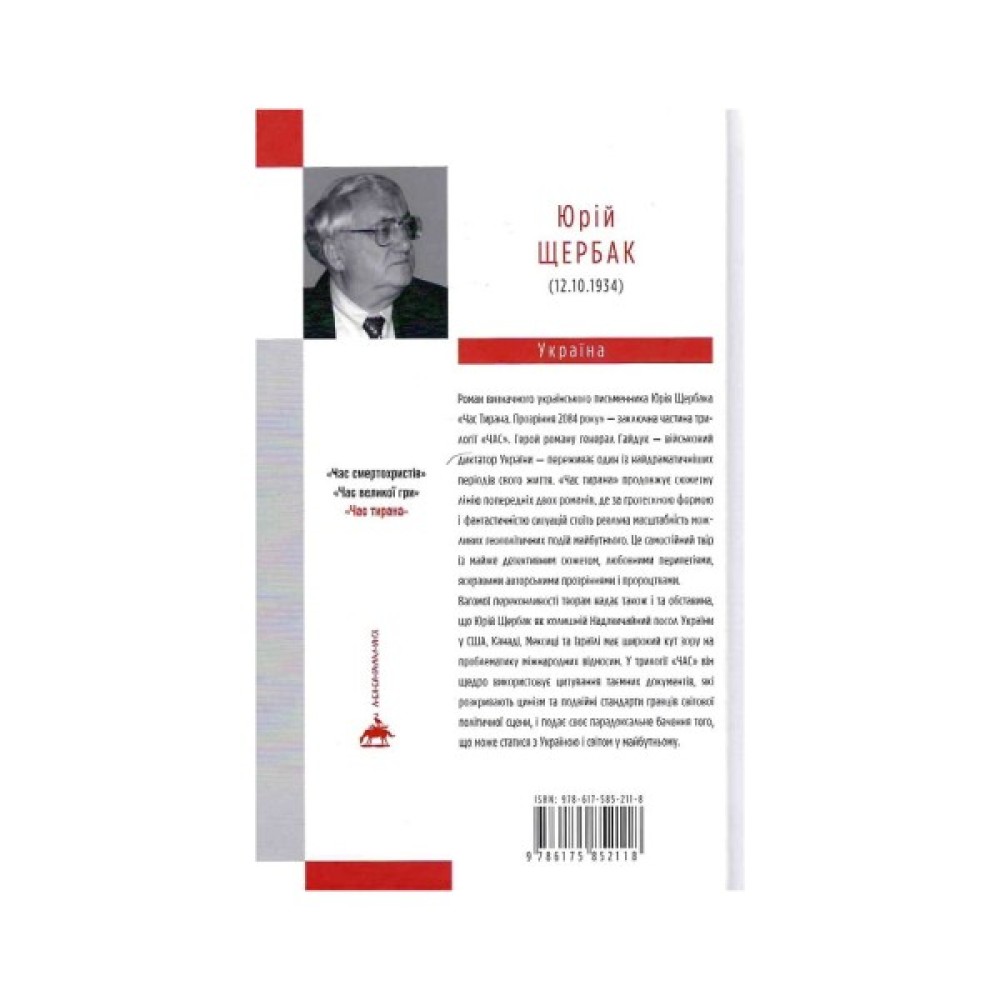 Роман визначного українського письменника Юрія Щербака «Час Тирана. Прозріння 2084 року» — заключна частина трилогії «ЧАС». Герой роману генерал Гайдук — військовий диктатор України – переживає один із найдраматичніших періодів свого життя. «Час тирана» продовжує сюжетну лінію попередніх двох романів, де за гротескною формою і фантастичністю ситуацій стоїть реальна масштабність можливих геополітичних подій майбутнього. Це самостійний твір із майже детективним сюжетом, любовними перипетіями, яскравими авторськими прозріннями і пророцтвами.