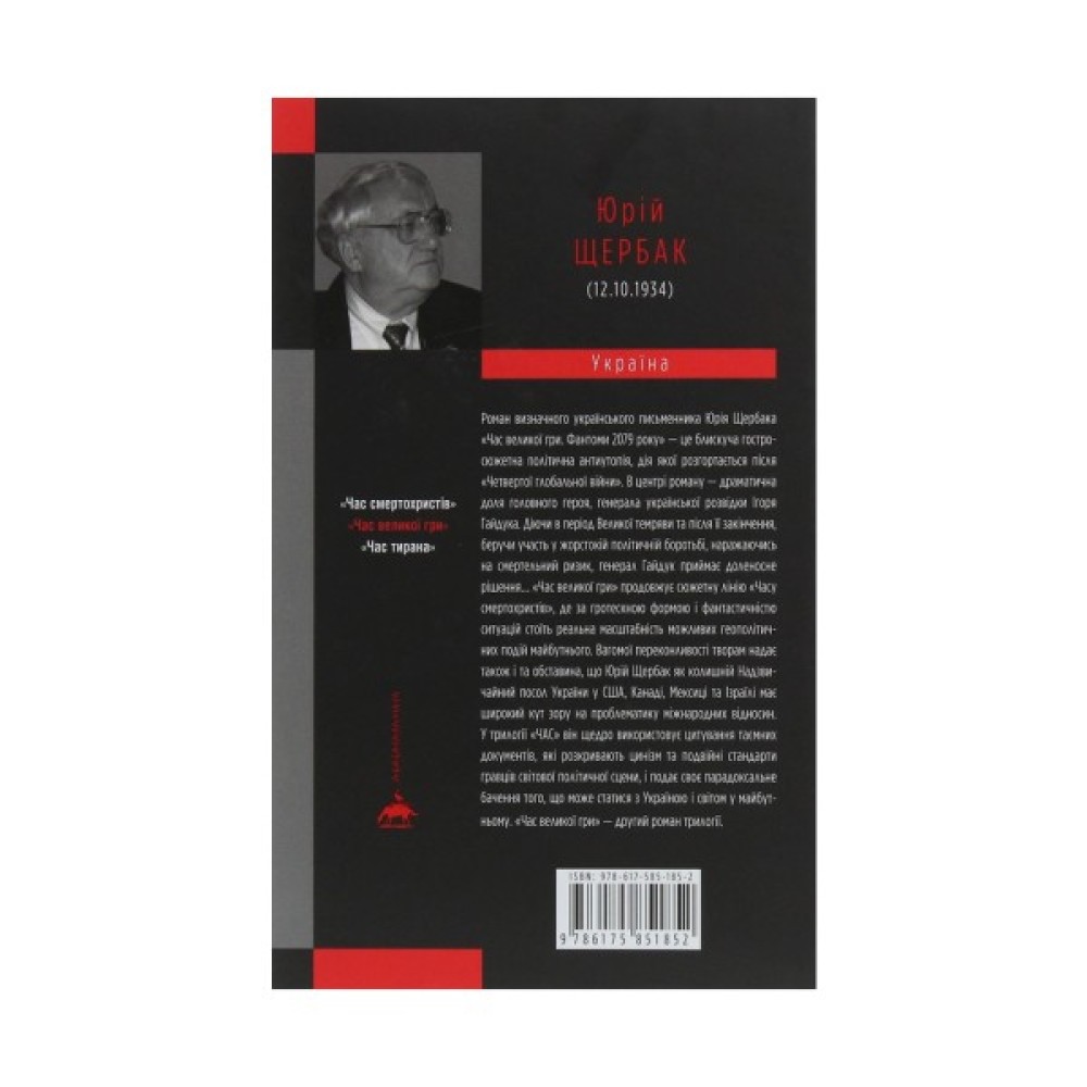 "Час Великої Гри" продовжує сюжетну лінію "Часу смертохристів", де за гротескною формою і фантастичністю ситуацій стоїть реальна масштабність можливих геополітичних подій майбутнього. Вагомої переконливості творам надає також і та обставина, що Юрій Щербак як колишній Надзвичайний посол України у США, Канаді, Мексиці та Ізраїлі має широкий кут зору на проблематику міжнародних відносин.