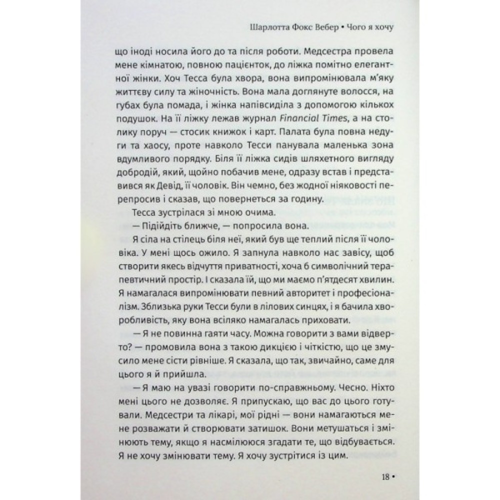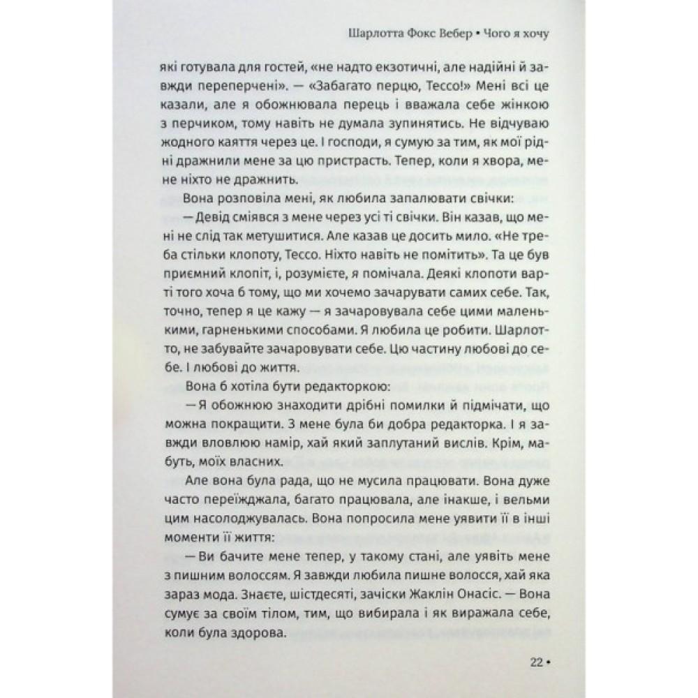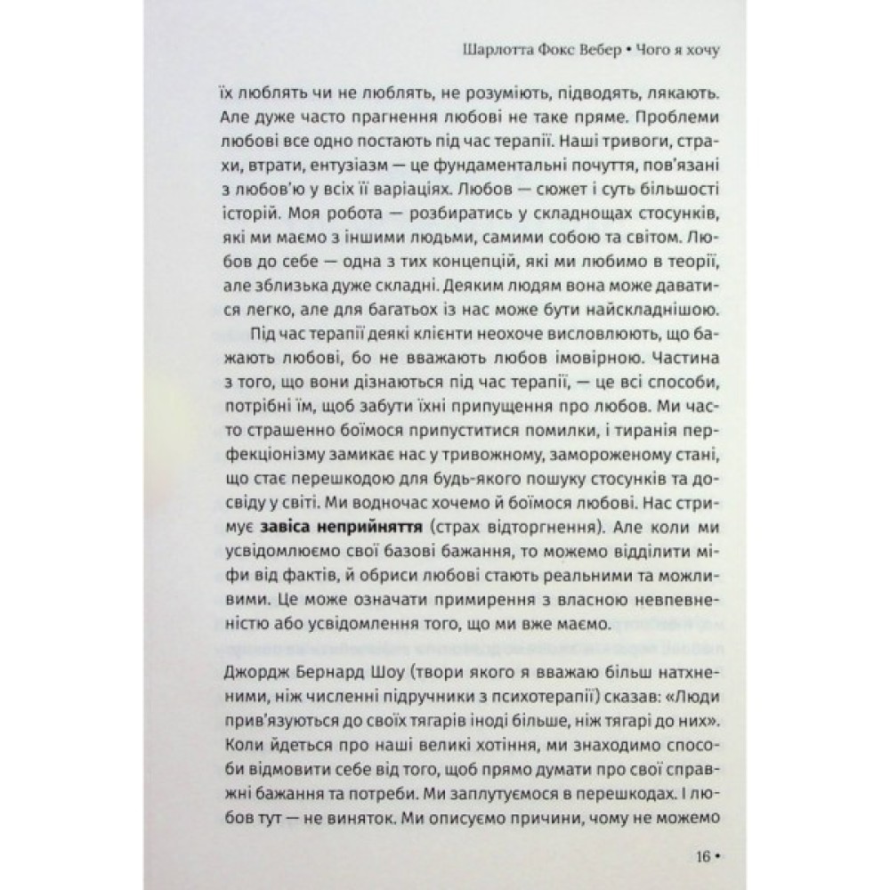 Психотерапевтка Шарлотта Фокс Вебер, донька відомої письменниці Кетрін Вебер, переконливо доводить: розуміння власних бажань повертає нас до себе і стає трампліном для особистісного зростання. Тож час подолати внутрішні суперечності, розпізнати та усвідомити, чого ми хочемо, щоб нарешті відверто поглянути на себе й почати отримувати задоволення від життя.
