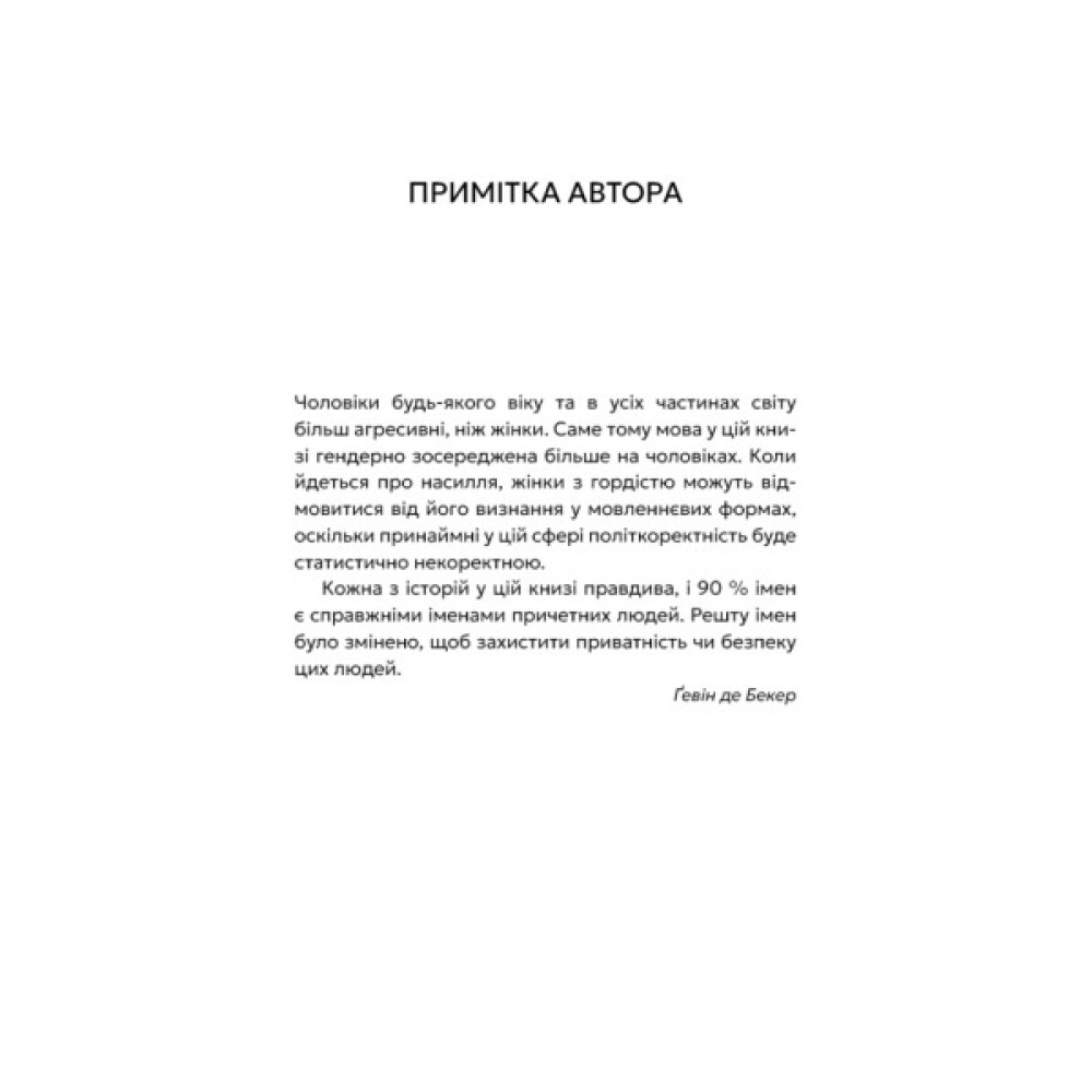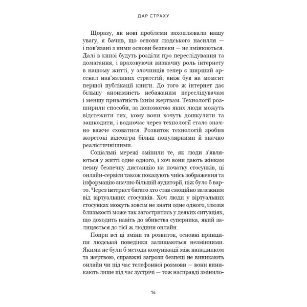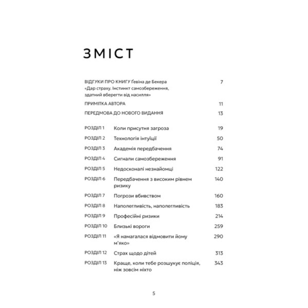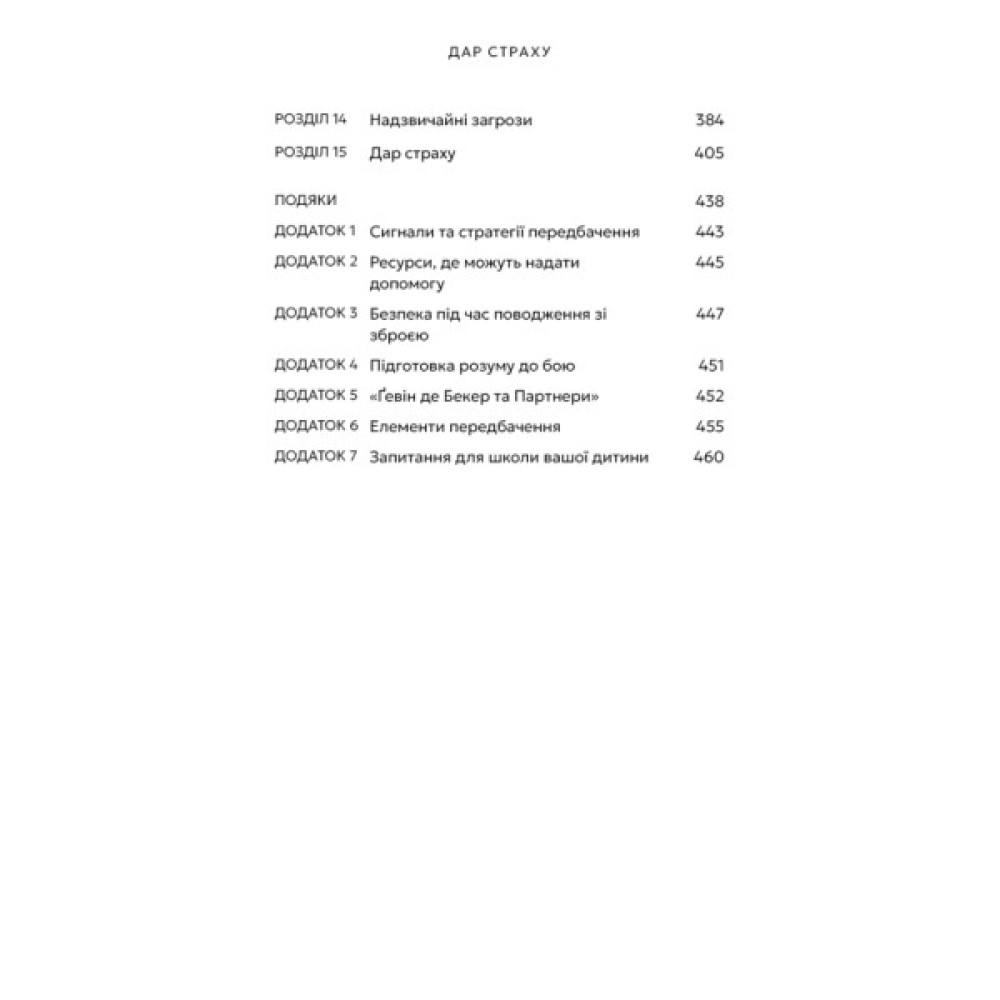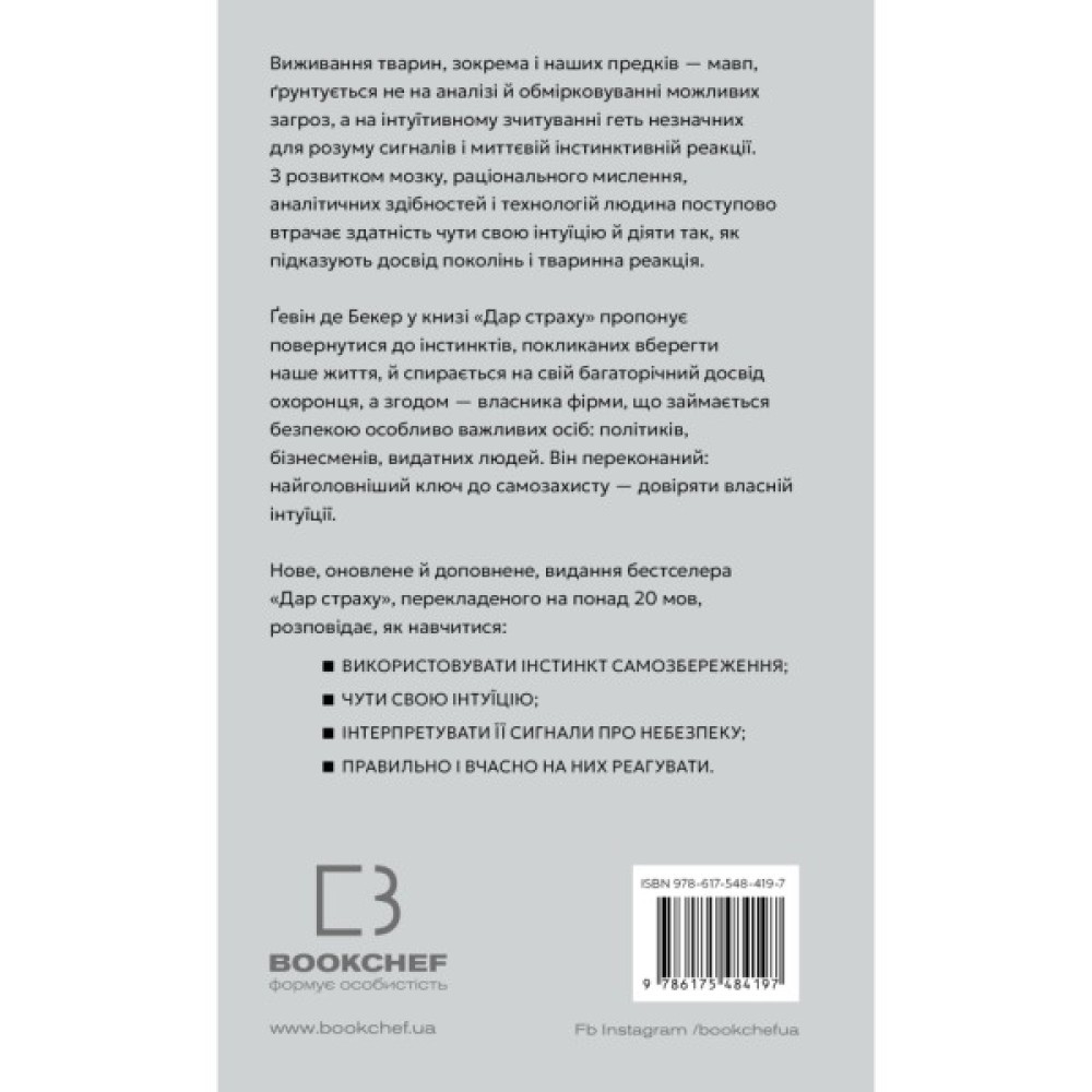 Виживання тварин і наших предків — мавп ґрунтувалося не на аналізі й обмірковуванні можливих загроз, а на інтуїтивному зчитуванні геть незначних для розуму сигналів і миттєвій інстинктивній реакції. З розвитком мозку, раціонального мислення, аналітичних здібностей і технологій людина поступово втрачала здатність чути свою інтуїцію й діяти так, як підказують досвід поколінь і тваринна реакція. У книзі «Дар страху» автор пропонує повернутися до інстинктів, покликаних уберегти наше життя, й спирається на свою багаторічну роботу охоронця, а згодом — власника фірми, що займається охороною особливо важливих осіб: політиків, бізнесменів, видатних людей. Найголовніший ключ до самозахисту — довіряти власній інтуїції. Книга «Дар страху» розповідає, як цьому навчитися.