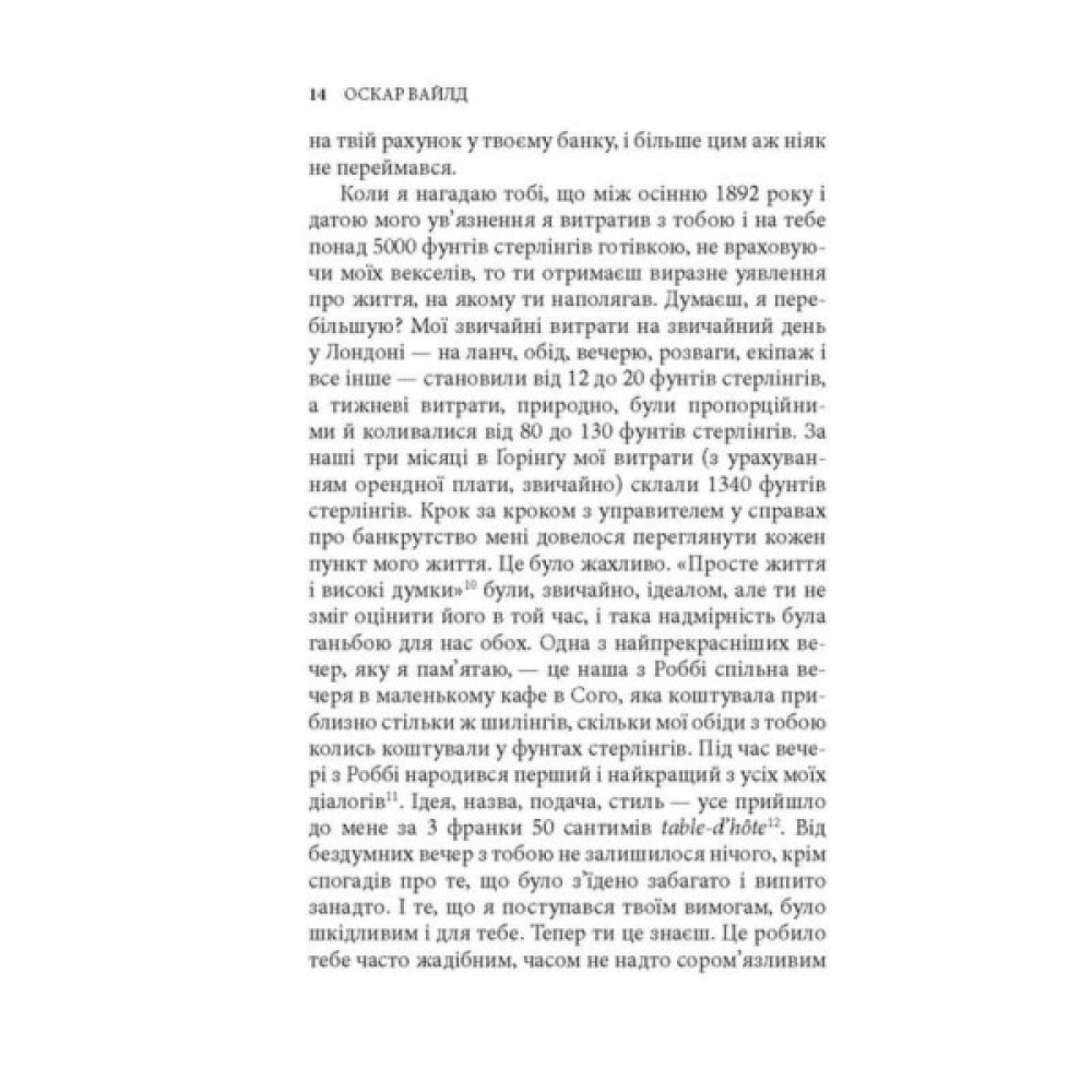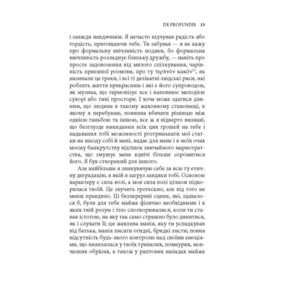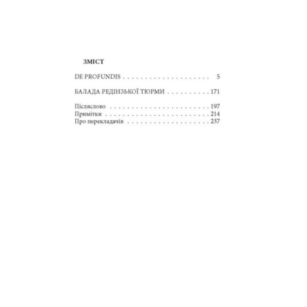У виданні представлено пізню творчість Оскара Вайлда (1854–1900), всесвітньовідомого ірландського англомовного поета, прозаїка, драматурга, есеїста, журналіста, речника естетизму, дотепника і майстра парадоксів, де на перший план виходять теми духовної еволюції через власне страждання та співчуття до чужих страждань.
