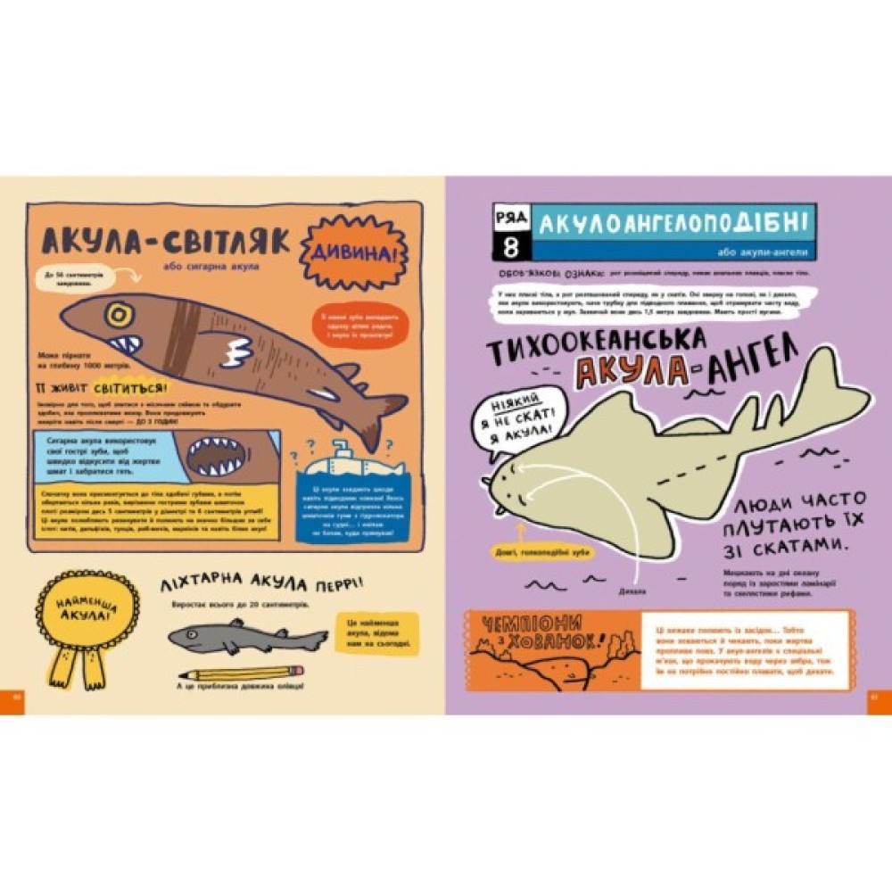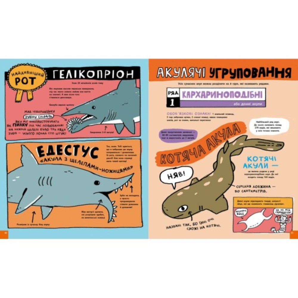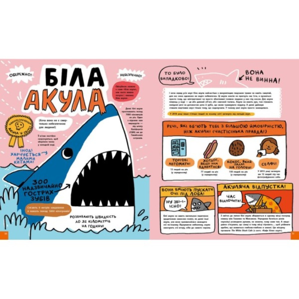 Фанатієш від акул? Вдихни повітря — час ГЛИБШЕ зануритися в цю тему! Факти з книжки «Дещо потрясне про акул та інших підводних істот» не можуть не дивувати. От ти знав/-ла, що в океані плаває майже 20 тонн абсолютно НІЧИЙОГО золота? А що імовірність померти, вдавившись хотдогом, вища, ніж від нападу акули? Та навіть кокос на голову з більшою ймовірністю впаде! Художник Майк Ловері, який створив цю книжку, як і ти, фанат підводного життя, а ще неабиякий дотепник!