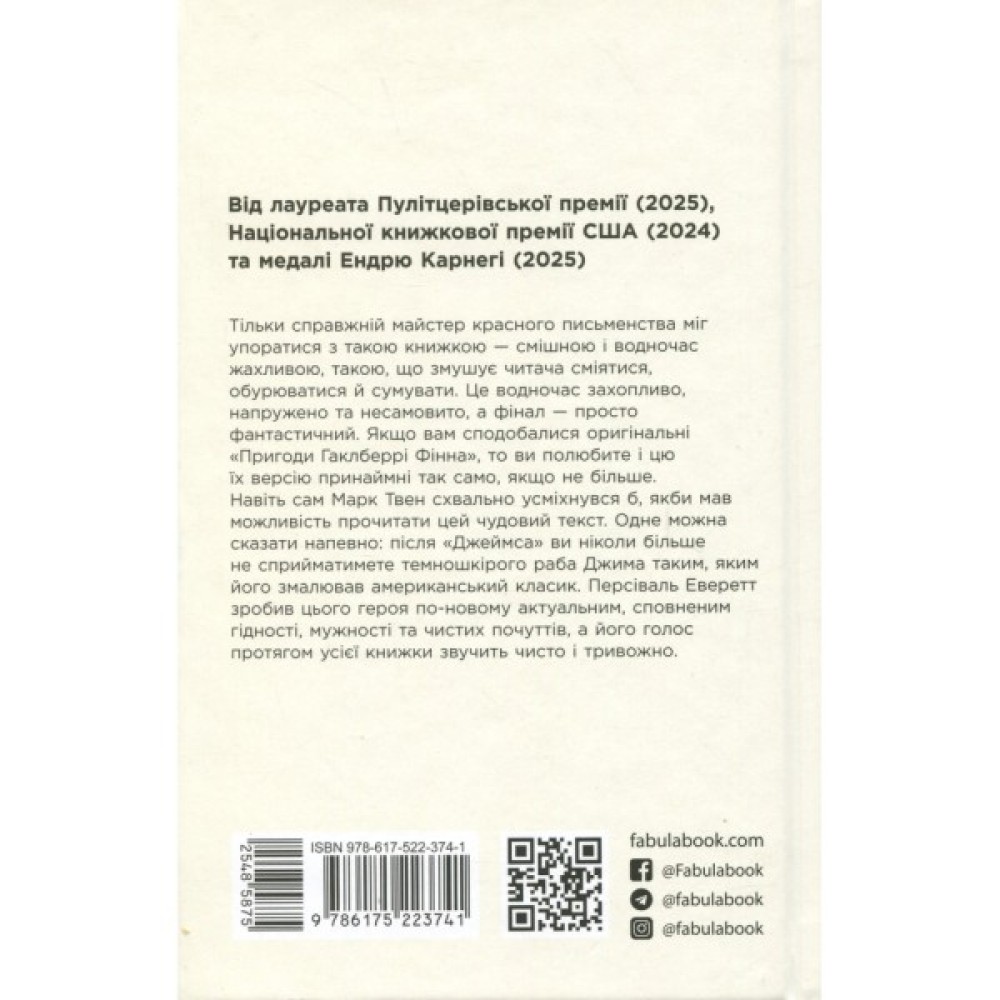 Короткий список Букерівської премії 2024 Лавреат Пулітцерівської премії 2025 «Джеймс» — блискуче, сповнене дії переосмислення «Пригод Гаклберрі Фінна»: чарівне, смішне, трагічне, часом жахливе — і, до того ж, розказане голосом раба Джима. Коли Джим дізнається, що його збираються продати новому господареві в Новий Орлеан, назавжди розлучивши з дружиною і донькою, він вирішує сховатися на острові Джексона на Міссісіпі, доки не зможе розробити план утечі разом із сім’єю. Тим часом Гак Фінн інсценує власну смерть, аби врятуватися від жорстокого батька, який нещодавно повернувся до міста.