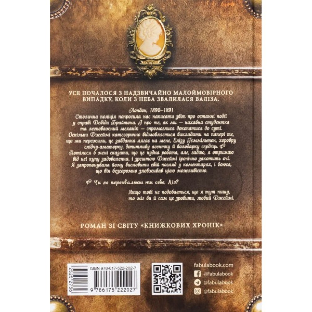 Фанати «Книжкових хронік», радійте! Нарешті ви дізнаєтеся таємницю валізи, що розтрощила скляний купол бібліотеки Королівського університету та призвела до знищення сотень книжок. А розкрити цю заплутану справу вам допоможуть рішуча та невгамовна Еліза Геммільтон і милий та дивакуватий Джеймі Леннокс.