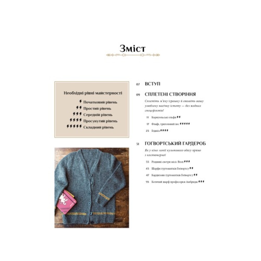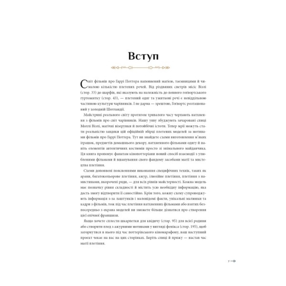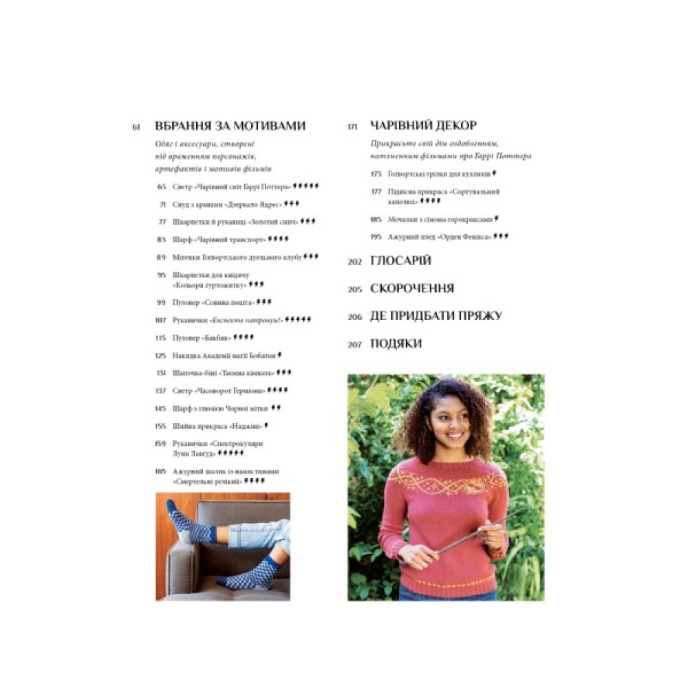 Цей посібник із рукоділля пропонує додати у свій дім і гардероб трішки магії з «Гаррі Поттера» за допомогою спиць, голки та пряжі. Авторка розмістила на сторінках книги 27 схем й описів для в’язання. Також вона ділиться викрійками одягу, проєктами домашнього декору, сувенірів, іграшок, які взяла прямо з фільмів. У книзі можна побачити навіть культові костюми. Схеми доповнені поясненнями специфічних технік, як от арани, багатокольорове й ілюзійне плетіння, ажур, вкорочені ряди, плетіння з намистинами тощо.