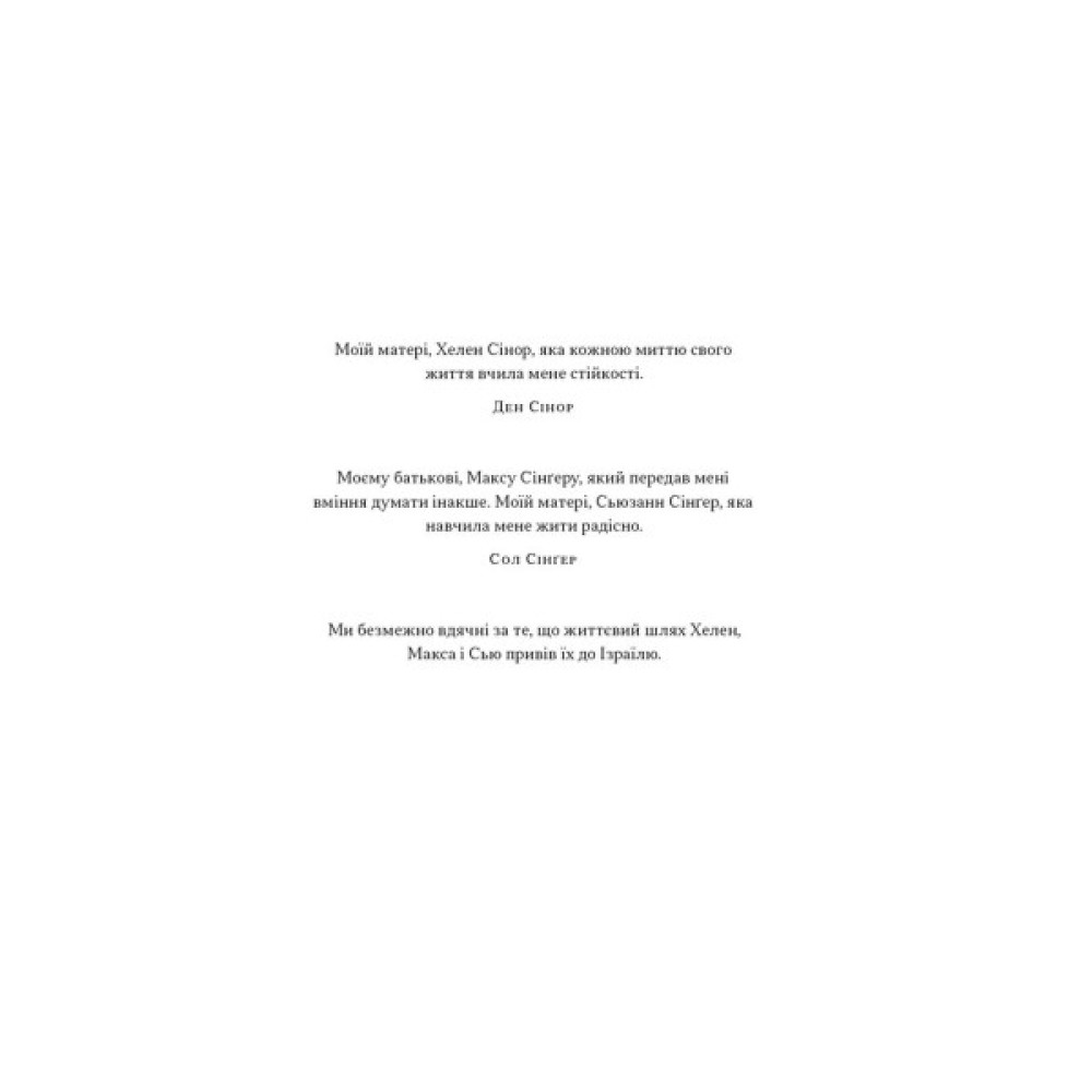 Сол Сінґер і Ден Сінор, автори бестселера «Країна стартапів», у своїй новій роботі досліджують парадокси ізраїльського суспільства і показують, що насправді потрібно людям, щоб бути щасливими.