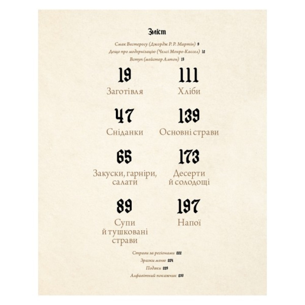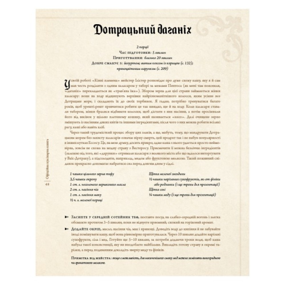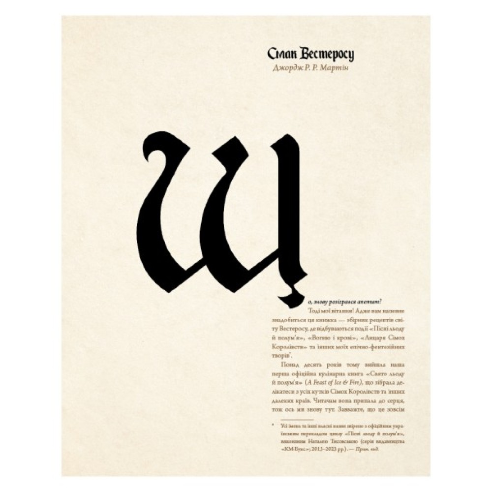 Зануртеся у світ «Пісні льоду й полум’я» Джорджа Р. Р. Мартіна за допомогою колекції з 80 смачних рецептів, натхненних історією Вестеросу. Якщо ви хочете пообідати з Володарями Драконів Старої Валірії чи випити чашечку меду з королем Робертом I, придбайте світовий рукопис майстра Цитаделі й розпочніть чудову подорож Сімома Королівствами.