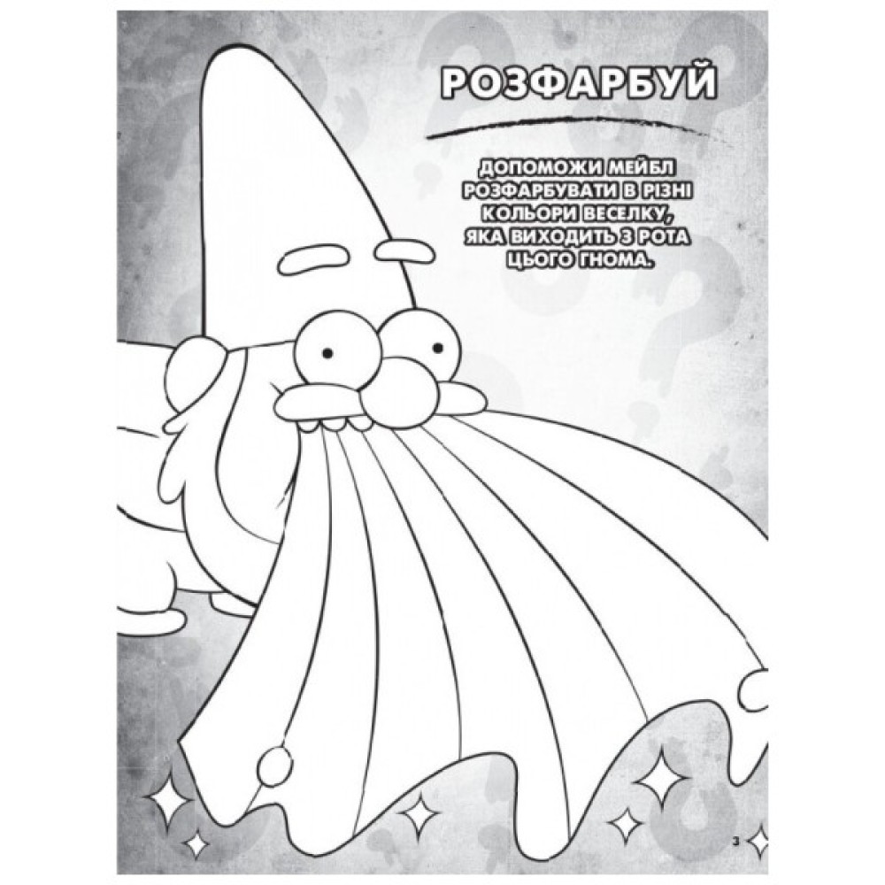 Зустрічай улюблених персонажів "Гравіті Фолз" на сторінках цієї загадкової розмальовки. У загадковому містечку знову безліч пригод і таємниць! Усередині книжки окрім сторінок для розфарбовування багато цікавих завдань. Понад 30 яскравих наліпок.
