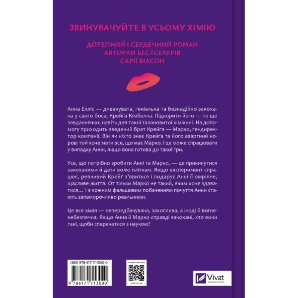 Книга «Хімія кохання» — це ромком про фіктивні стосунки, написаний американською авторкою Сарією Вілсон. Щоб закохати у себе боса, потрібно використати небезпечний, але потужний реактив — потенціал енергії ревнощів. У цьому переконана Анна Елліс, видатна, ексцентрична науковиця, що планує зірвати весілля красеня Крейґа Кімбелла. Він обіймає посаду віцепрезидента в компанії, на яку працює Анна, і цей чоловік просто мусить бути її! Так, підхід дещо самовпевнений, егоцентричний та зухвалий, але без уваги й турботи Крейґа жінка ніколи не стане щасливою.