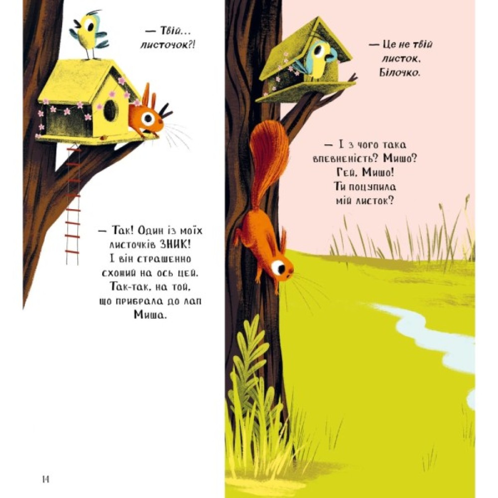 В першій історії, «Хто поцупив листя?», герой виявляє: його улюблене дерево більше не вкрите зеленим листячком. Його вкрали! Звісно ж, у рудого детектива повен ліс підозрюваних! Так розпочинається кумедна метушня, але для самого шукача справедливості то є дуже серйозний детектив! Білченя носиться у пошуках таємничого крадія, щоб зрозуміти: винна осінь. Трохи меланхолійна, але надзвичайно красива пора року, в якій є власна естетика та затишок.