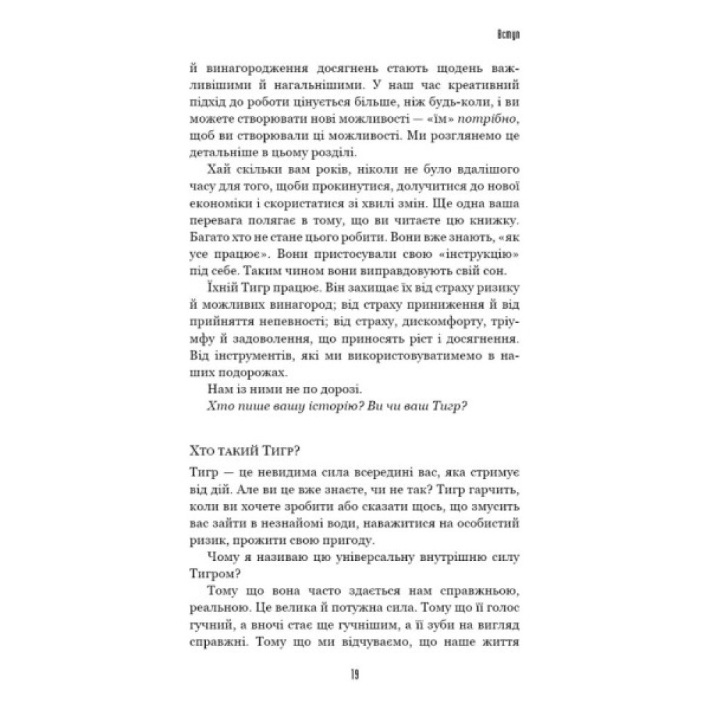 Найбільше нам заважають жити наші страхи. Вони нагадують тигрів, які загрозливо гарчать і повсякчас нагадують: «Не рипайся! У тебе нічого не вийде!». І ми лякаємося, зупиняємось, а то й відступаємо, втрачаючи можливості й сходячи зі шляху, який міг би привести до щастя. Міг би, якби ми хоча б спробували на нього стати. Але для цього нам спочатку потрібно позбавитися страху.