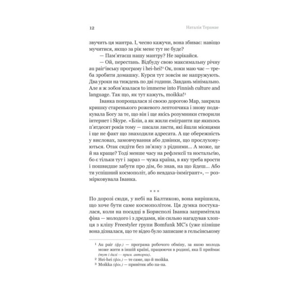 «Іммігрантка» — дебютний роман авторки, яка довгий час прожила у Фінляндії і почала досліджувати тему українського мігранства до того, як це стало масштабним викликом для всієї України у 2022 році. Це історія про непроговорені травми, життя за кордоном і доленосність тимчасових рішень.