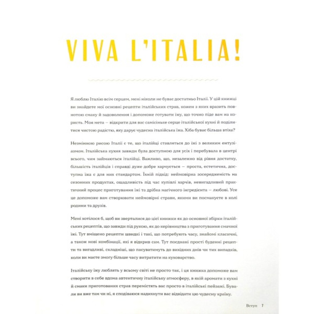 У книжці «Італійські страви з Джеймі Олівером» відомий британський шеф-кухар зібрав понад 150 автентичних рецептів від справжніх знавців італійської кухні — бабусь і мам з різних куточків Італії. Олівер пропонує як класичні, добре відомі страви, так і нові комбінації продуктів, які віднайшов сам, та пропагує основні принципи італійських кухарів: сезонність, ощадливість, легкість, насолода від процесу куховарства. До кожного рецепта ретельно прораховано калорійність та визначено баланс інгредієнтів. А що італійська їжа проста й естетична водночас — ви готуватимете із великим задоволенням!