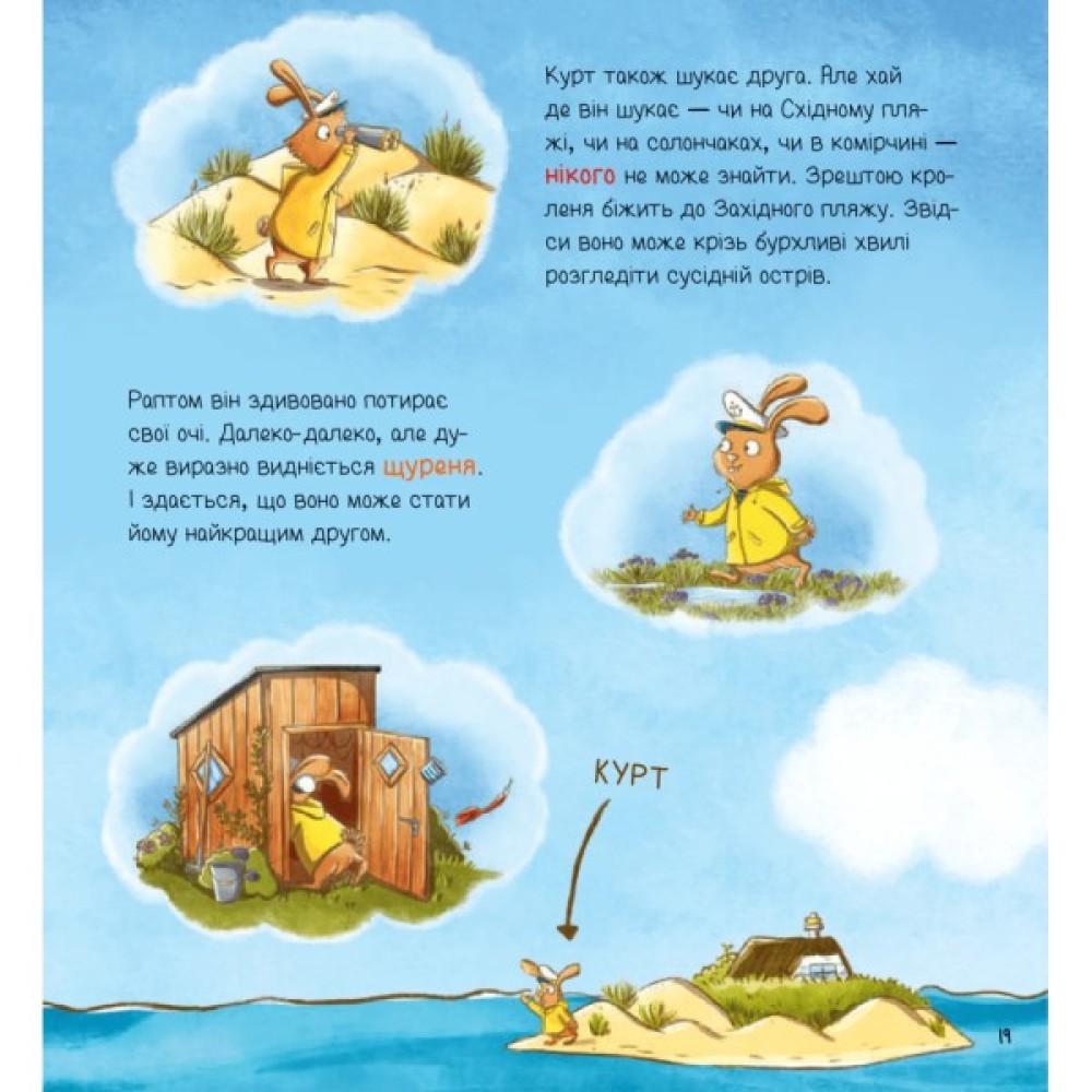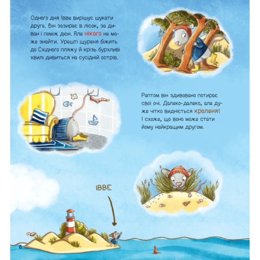 Щуреня Івве живе на острові посеред моря. Івве обожнює гомін штормів, піщані дюни та свій старий маяк. Кроленя-капітан Курт живе на іншому острові посеред моря. Курт обожнює солоне повітря, свій рибальський будиночок і велику зелену дамбу. І вони обидва почуваються досить-таки самотньо... Чи не круто було б поділитися з кимось своїми захопленнями? Із другом? Але що ж робити, якщо дружба вже майже на носі й водночас так далеко? Треба гарненько поміркувати…