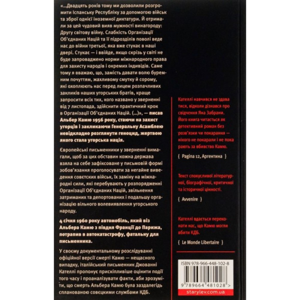 1960 року в дивній, за словами очевидців, автокатастрофі загинули Альбер Камю та його друг і видавець Мішель Галлімар. А через кілька десятиліть до рук італійського письменника Джованні Кателлі потрапляють факти, які ставлять під сумнів загальноприйняту версію. Ґрунтуючись на ретельному документальному дослідженні, Джованні Кателлі будує переконливі й сенсаційні гіпотези того, що 46-річний філософ і письменник Альбер Камю став жертвою навмисного, спланованого вбивства КДБ.