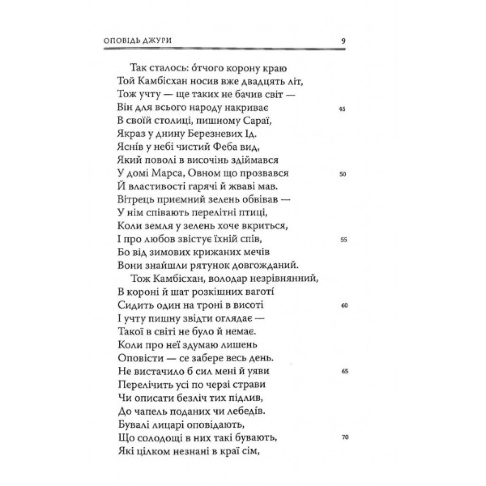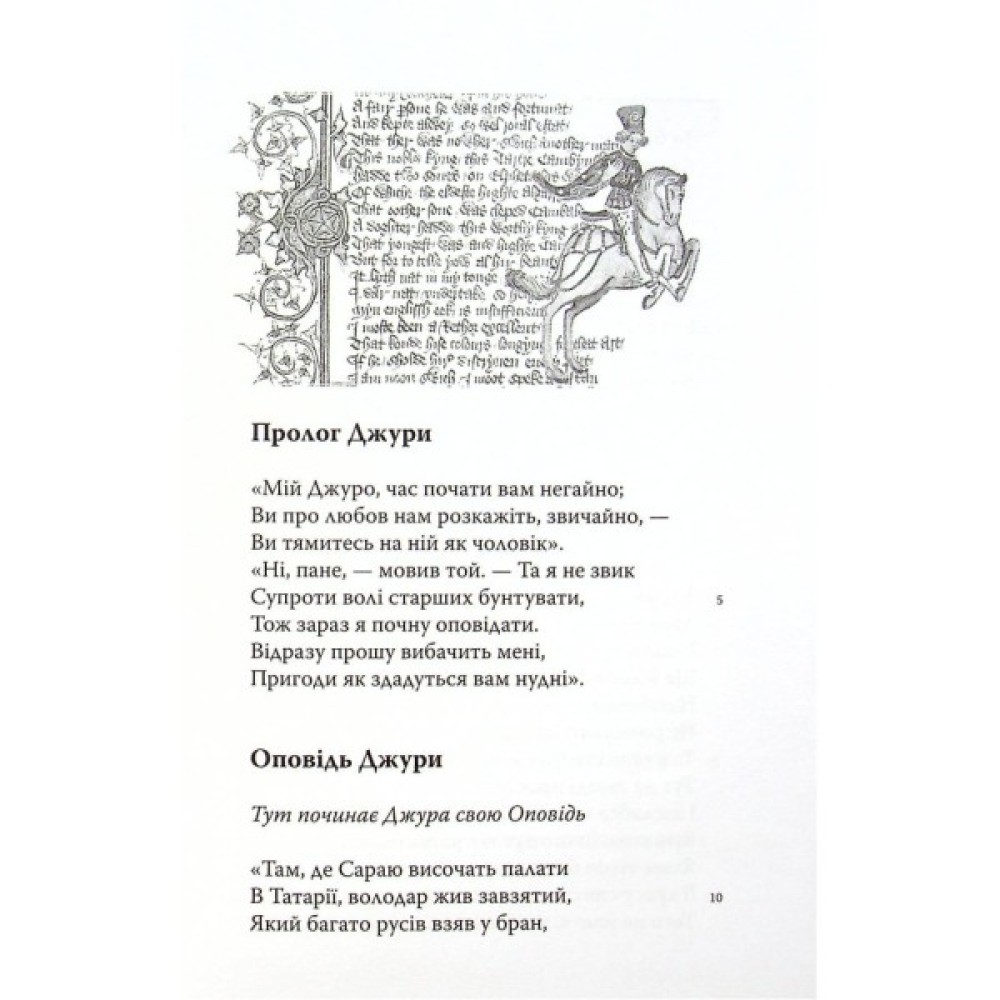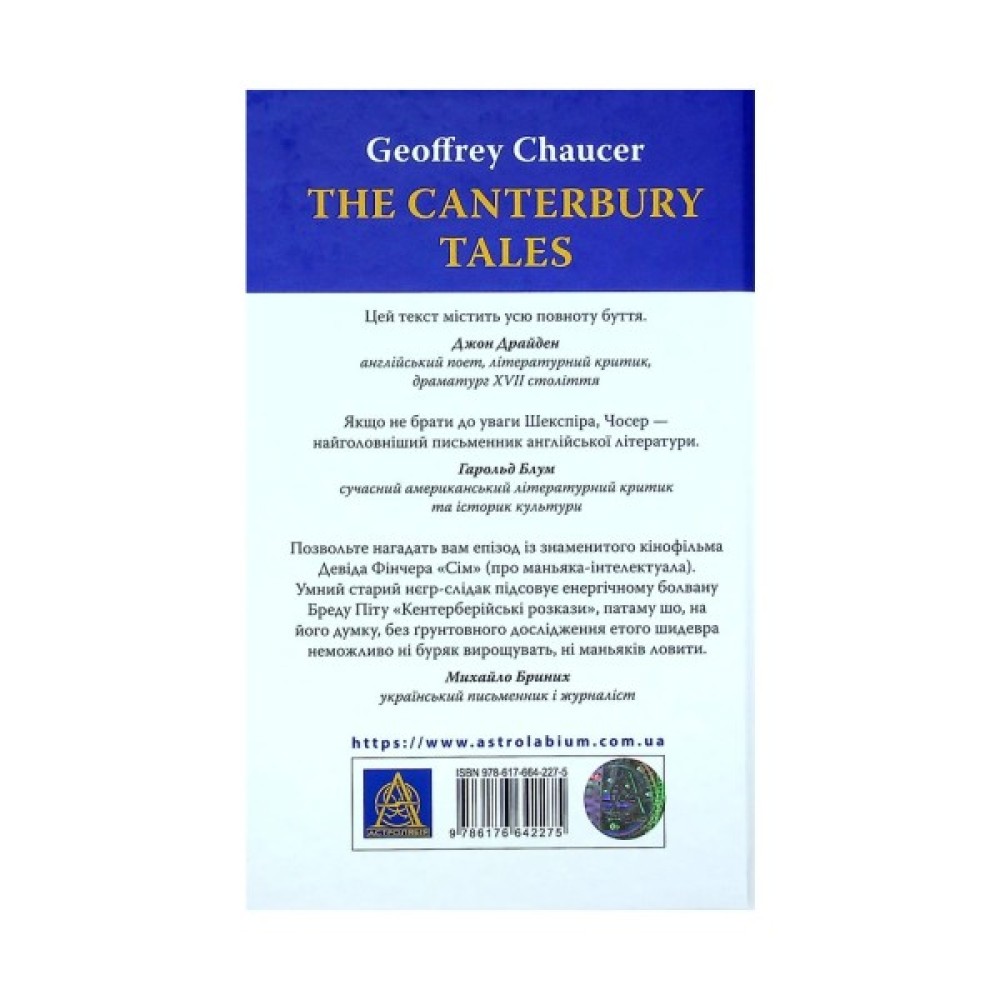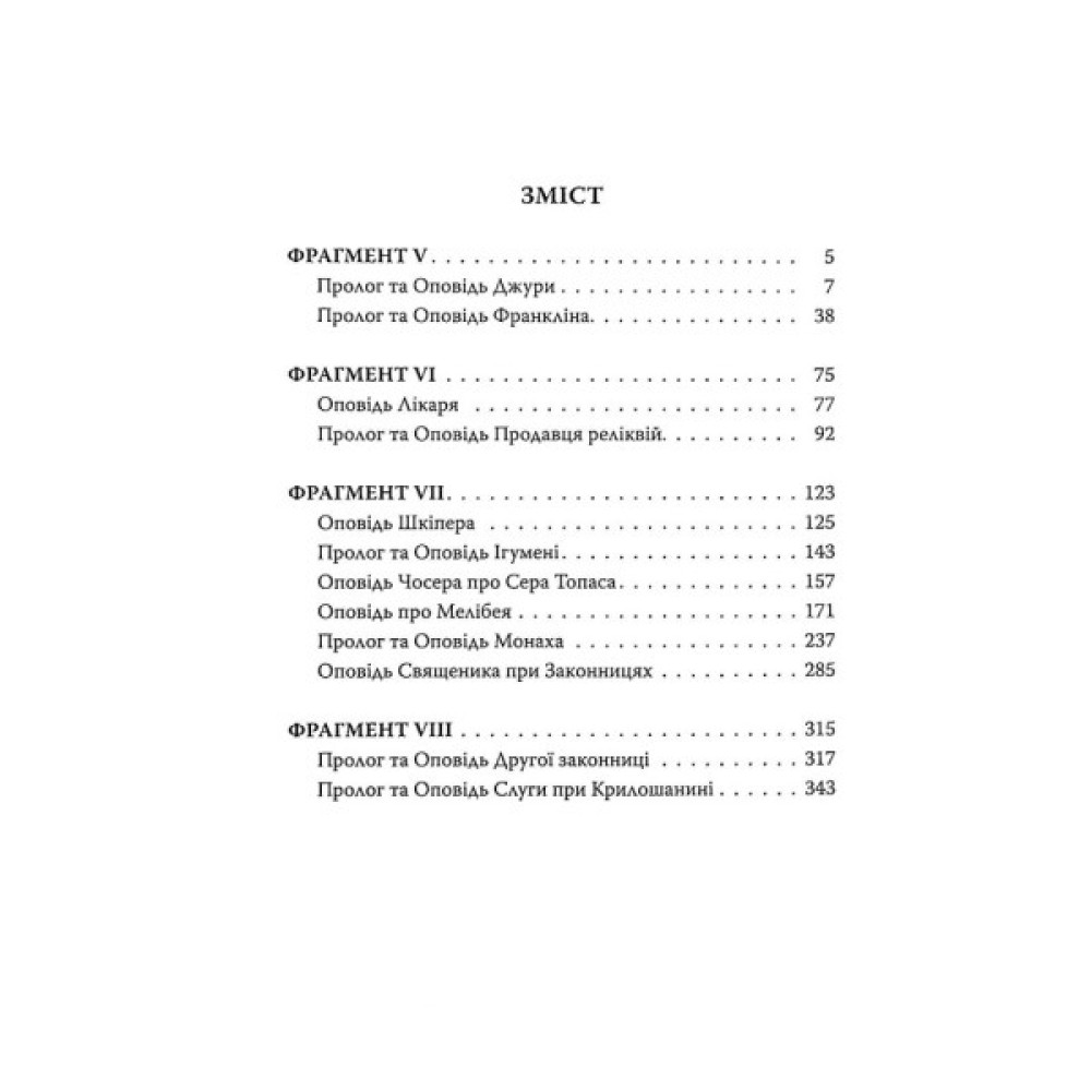Перший український переклад шедевра класика англійської літератури Джеффрі Чосера (бл. 1343–1400). Це збірка історій, які розповідають одне одному прочани, що вирішили піти на прощу до гробниці святого Томи Бекета в Кентербері. Серед оповідачів — представники майже всіх верств тогочасного англійського суспільства, а їхні розповіді, вельми різноманітні за тематикою, влучно відображають триб їхнього життя. Це своєрідна енциклопедія життя середньовічного суспільства. Окрім блискучої неповторної іронії, властивої стилю цього шедевра, для нього характерні жвавість, нескінченна доброта, безмежна довіра до людей і надзвичайне уміння захоплюватися навіть жахливими рисами, які часом демонструють його герої. Книга проілюстрована фрагментами Еллесмерівського манускрипту 1410 року.