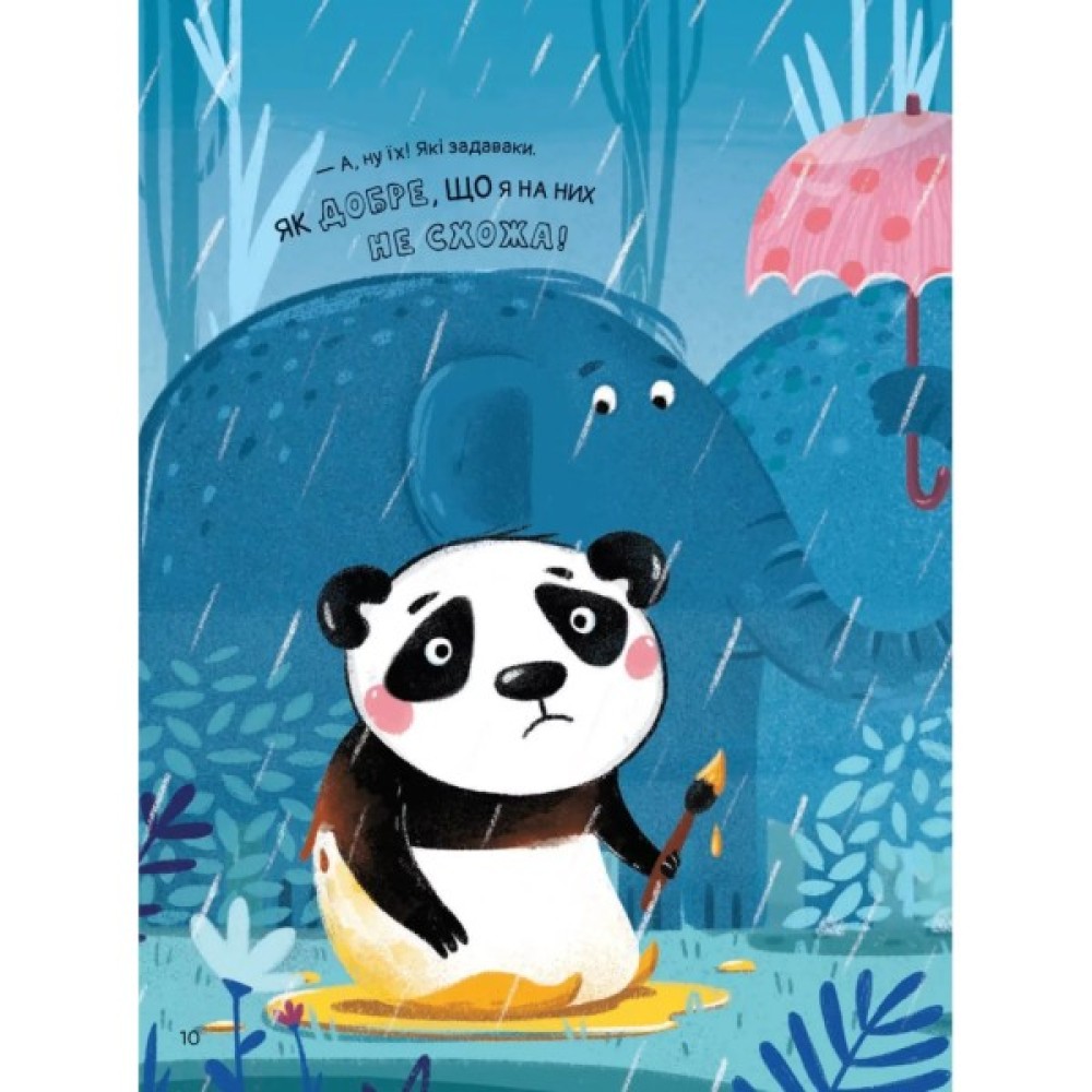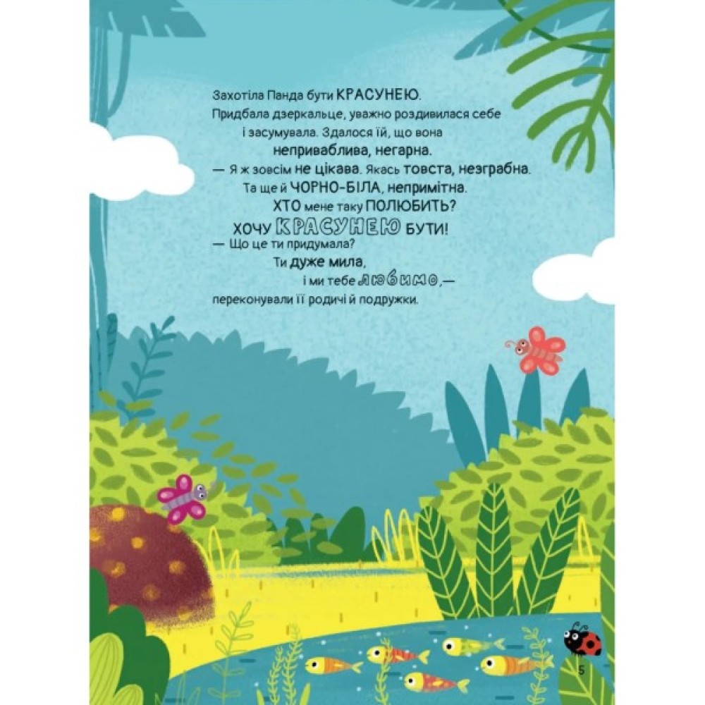 Утім, головний мотив «панди чудові», минає повз вушка маленької. Вона впродовж книги намагається перетворитися то на птаха, то на черепаху, бо її уявлення про красу змінюються. Врешті-решт, після марних спроб полюбити себе щоразу нову, стається подія, яка переконує Пандочку остаточно: вона прекрасна, зі своїм пухнастим животиком і милим «макіяжем» від природи.