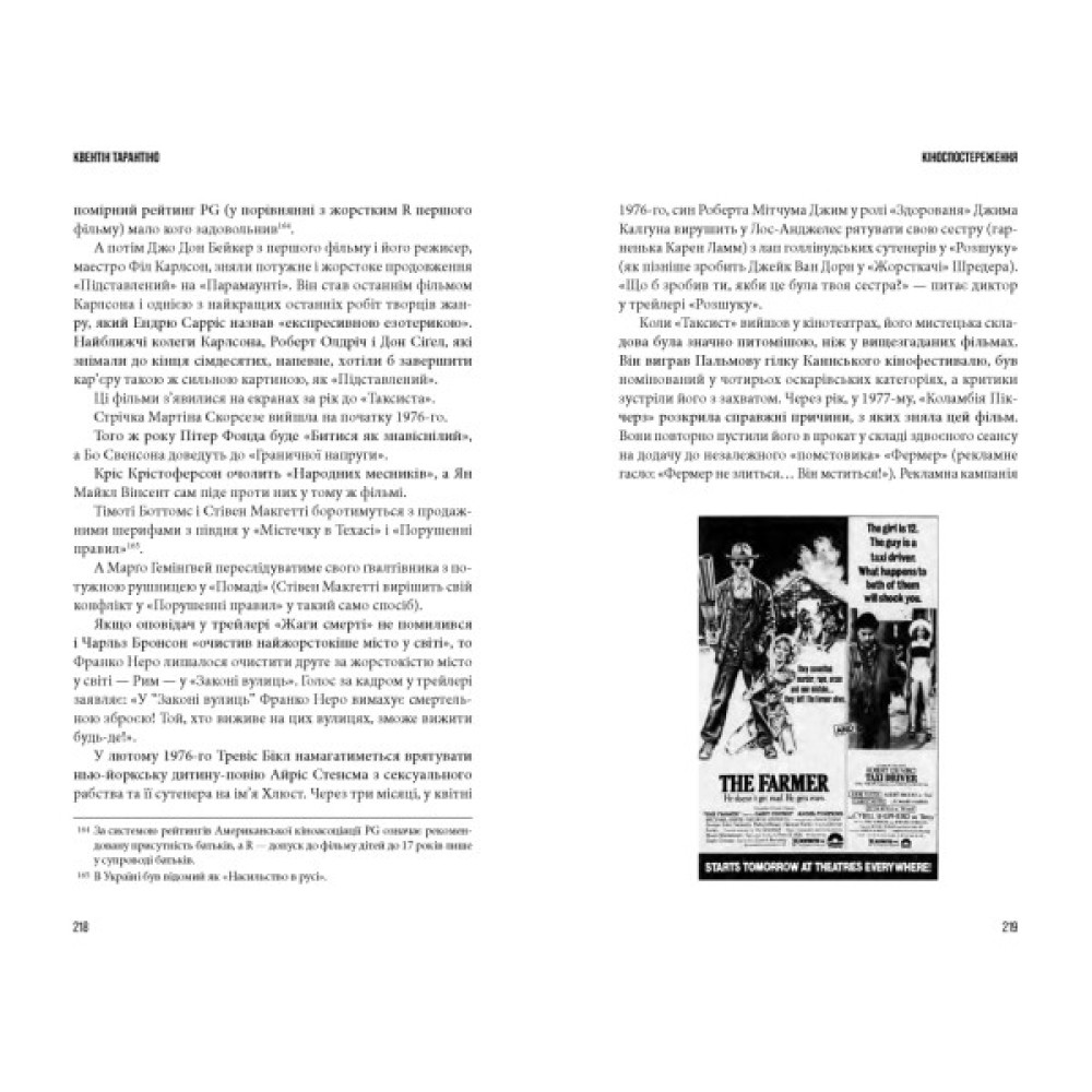 Тарантіно — унікальний випадок у кінематографі. Хлопчик, закоханий у кіно, що пройшов доволі нетривіальний, як на голлівудського режисера, шлях (за його власними словами, «я не ходив у кіношколу, я ходив у кіно»). Його творчість не вкладається у сталі жанрові рамки, він ніколи не тяжів до лінійності сюжету, і ця книга не виняток.