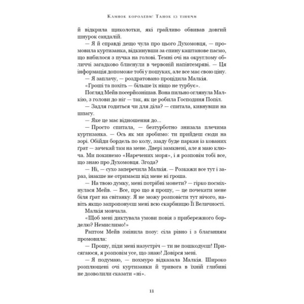 Пасербиця короля, герцогиня-бастард, людина принцеси, клинок королеви — вона має багато прізвиськ, але чи хоч одне з них вірне? Малкія Денмір — герцогиня за правом народження і клинок королеви за посадою. Вона почувається білою вороною у Елмессарському палаці, й лише прихильність принцеси надає сенс її життю і забарвлює його у яскраві кольори. На жаль, трагічні події змушують Малкію покинути палац.