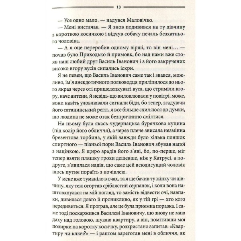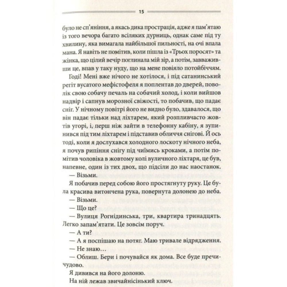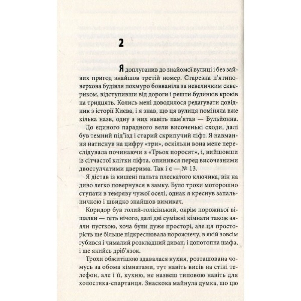 Журналіст Андрій Крайній — справжній ерудит, вільно володіє живими й мертвими мовами, але з матеріальними цінностями якось не склалося: доживши до віку Христа, не має даху над головою. Не йому, безхатченку, гребувати теплим помешканням — хай навіть заповітний ключ простягнув йому дивакуватий незнайомець, а номер квартири навіює забобонний страх. Що ж це було: манна небесна чи прикра помилка? Незабаром Крайньому знадобляться ще два ключі: до таємниці зникнення господаря квартири номер 13 і до серця фатальної жінки, до якого не так легко достукатися...