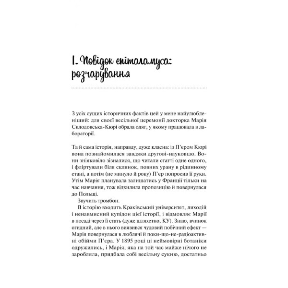 Фіолетововолоса Бі Кеніґсвассер, певною мірою лицарка-джедай, берегиня цілосвітньої рівноваги, чинить, як учинила б Марія Кюрі. Авжеж, пані Кюрі пристала б на пропозицію очолити проєкт своєї мрії від NASA. Та керувати проєктом разом із Леві Вардом — матір сучасної фізики, рятуй! Заклятим ворогам краще працюється в різних галактиках, стверджував Леві-аспірант. Має статися лиха пригода, щоб одного (насправді першого ж) робочого дня Кеніґсвассер опинилася в міцних обіймах Варда. І поки дівчина намагається давати собі раду без потрібного обладнання, колегіальної підтримки та, як їй ввижається, кар’єрних перспектив, саме Леві перетворюється на союзника… й очей із неї не зводить. Від нових можливостей їй палають нейрони. Та коли настає час ризикнути власним серцем, Бі мусить відповісти на критично важливе запитання: як учинила б… Бі Кеніґсвассер?