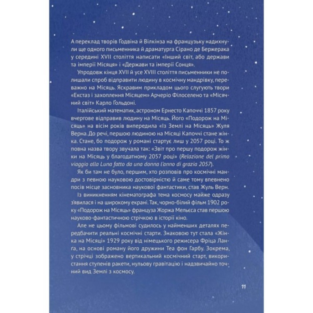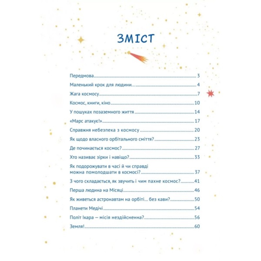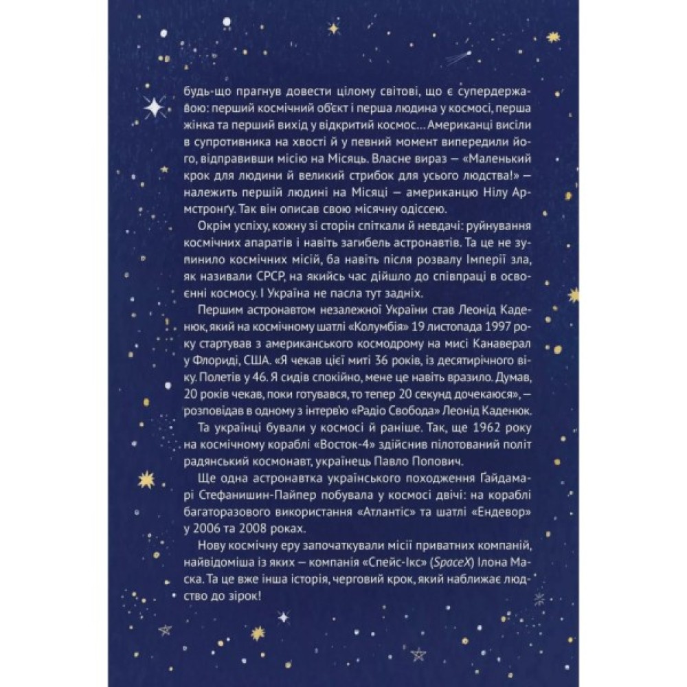 Ти переглядаєш сторінку цікавезної книжки про космос, а також про людську допитливість і сміливість. Читаючи її, ти крок за кроком, сторінка за сторінкою заглиблюватимешся у Всесвіт із його незліченними таємницями й загадками. Це будуть незабутні позаземні мандри з героями книжок і фільмів про космос.