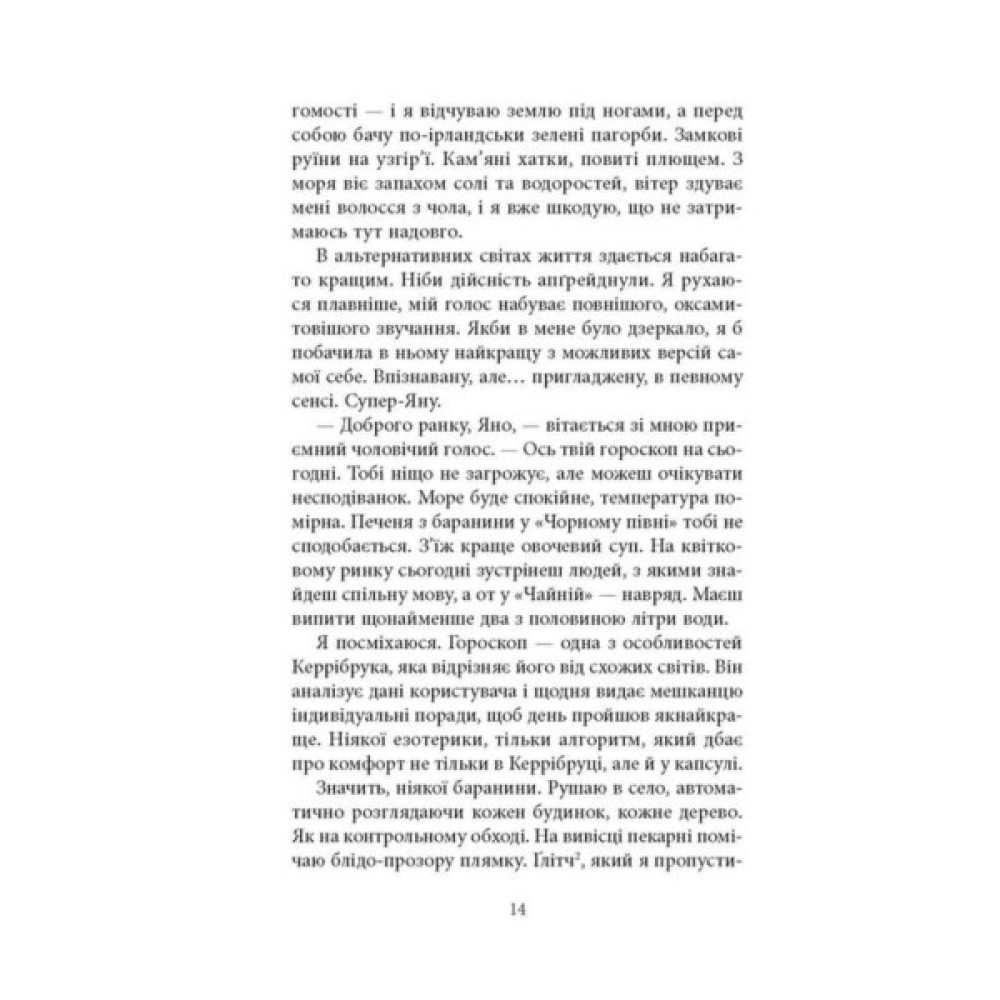 Яна — успішна дизайнерка віртуальних світів. Вона створює альтернативну реальність, її світи — фентезійні країни, доісторичні континенти, давно зруйновані міста — дуже популярні серед тих, хто цінує затишок і безпеку. Аж раптом саме у Керрібруці, наймирнішому зі світів, стається сенсаційне вбивство!.. Неймовірно захопливий, майже детективний і застережливий роман!