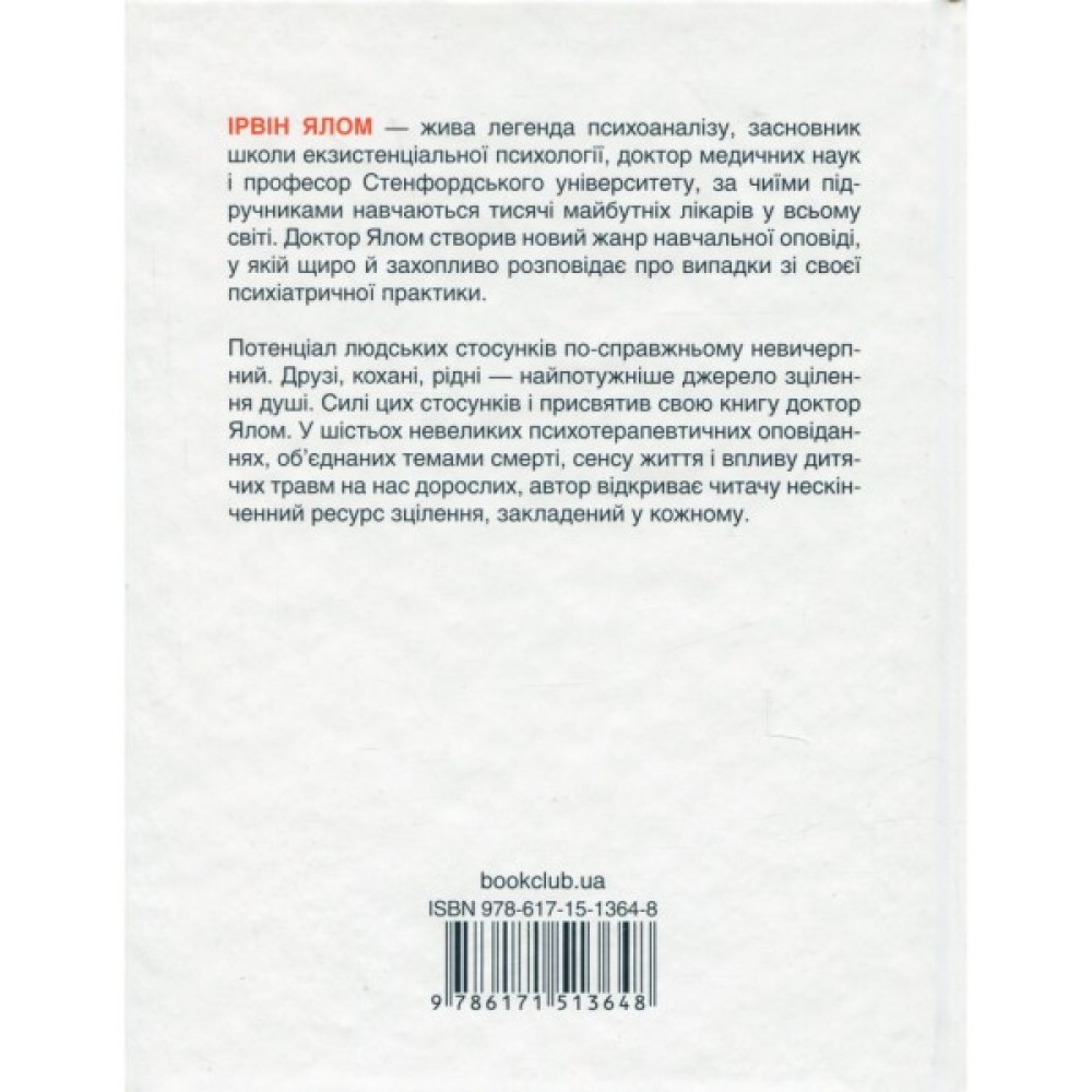 Потенціал людських стосунків по-справжньому невичерпний. Друзі, кохані, рідні — найпотужніше джерело зцілення душі. Силі цих стосунків і присвятив свою книгу доктор Ялом.