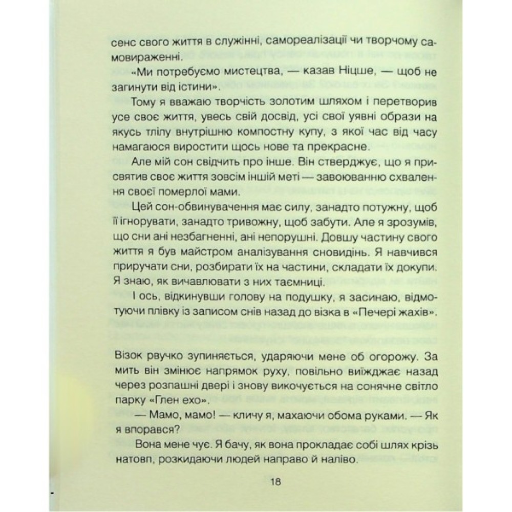 У шістці невеликих психотерапевтичних оповідань, об’єднаних темами смерті, сенсу життя і впливу дитячих травм на нас дорослих, автор відкриває читачу нескінченний ресурс зцілення, закладений в кожному з нас. Пацієнт та лікар тут наче міняються місцями.