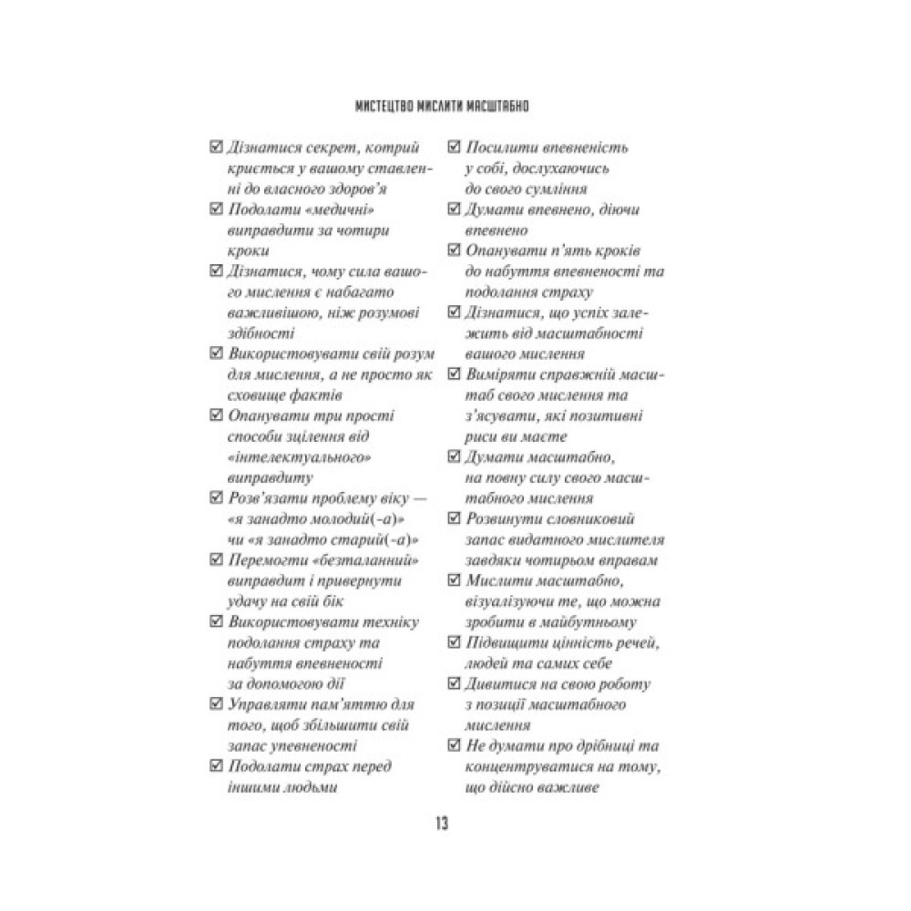 Книга «Мистецтво мислити масштабно» — це нонфікшн із саморозвитку від доктора філософії та коуча з лідерства Девіда Дж. Шварца. Американський автор заглибився в психологію людини, щоб створити низку порад, які допоможуть налаштуватися на позитивне мислення й досягти успіху. Шварц переконаний, що самокритика й зневіра у власних силах перешкоджає розкриттю потенціалу особистості. Постановка великих цілей — не надмірне мрійництво, а шлях до самовдосконалення, професійного зростання й побудови здорових міжособистісних стосунків.