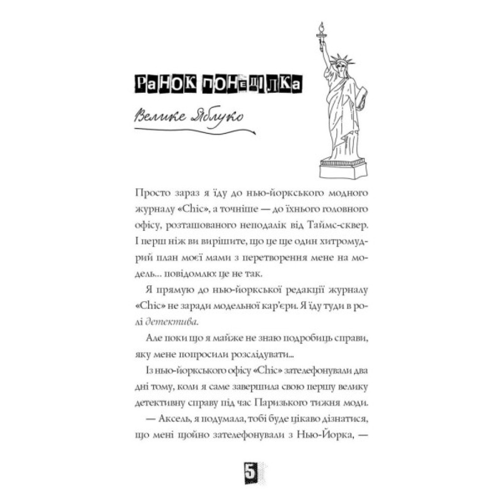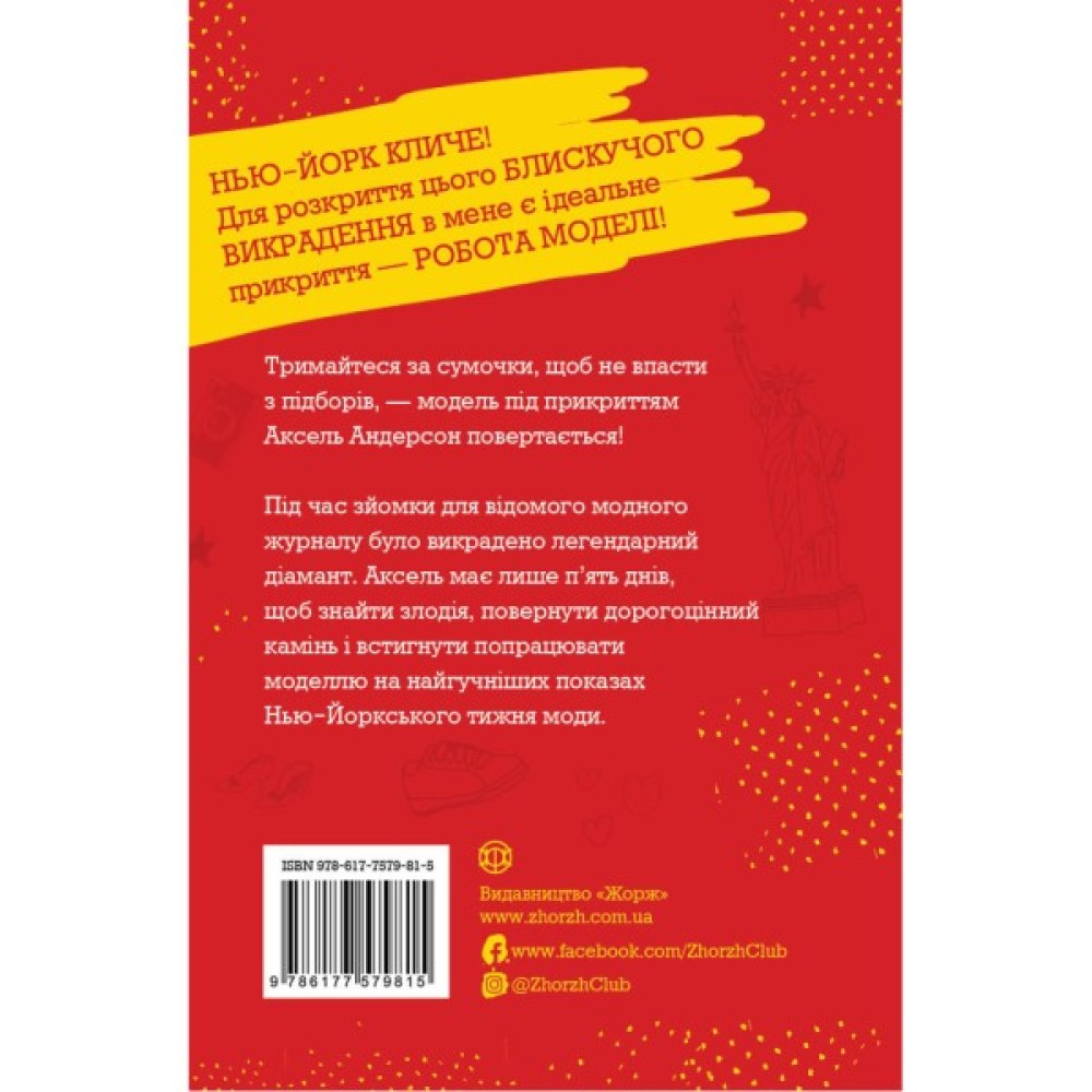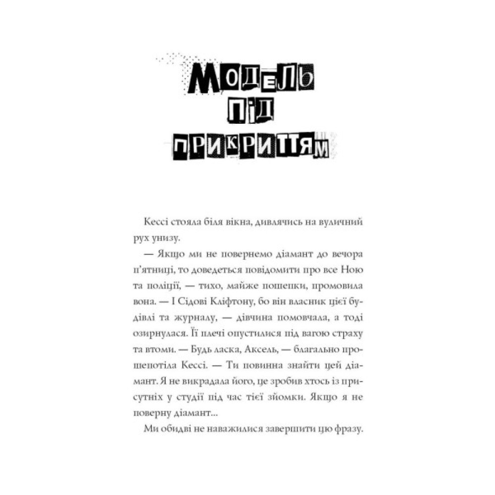 Друга книга циклу. Аксель ще не встигла оговтатися після розкриття гучного злочину в Парижі, а на неї вже чекає нова модна справа. У Нью-Йорку під час гламурної фотосесії зник легендарний чорний діамант. Найстильнішому детективу у світі знову доведеться стати на підбори і працювати під прикриттям моделі. Та, схоже, що цього разу удача відвернулася від Аксель: злочинець завжди на крок попереду, а час невблаганно збігає…