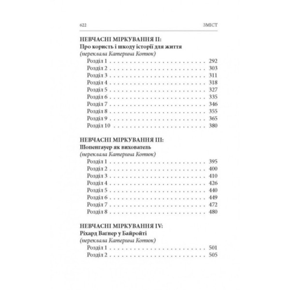Цей том містить ранні твори — «Народження трагедії» та чотири «Невчасні міркування»: «Давід Штраус як сповідник і письменник», «Про користь і шкоду історіїдля життя», «Шопенгауер як вихователь» і «Ріхард Ваґнер у Байройті». Тут уважний читач має нагоду прочути основну — трагічну — тональність творчості філософа, що дозволить не заблукати в лабіринті його на позір хаотичного мислення.