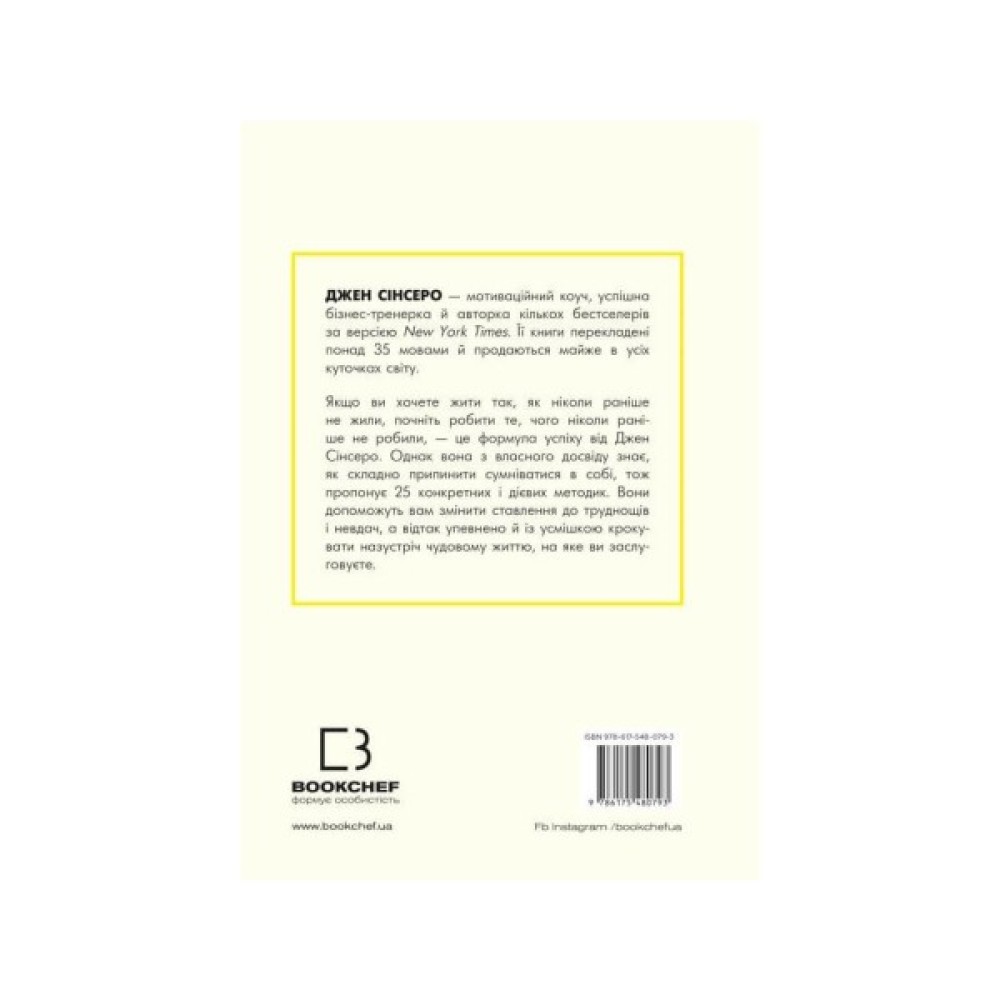 Одна з найдієвіших формул, покликаних змінити життя, радить почати робити те, чого ніколи не робив, якщо хочеш отримати те, чого ніколи не мав. Саме до цього закликає й Джен Сінсеро — авторка культового бестселера, який вийшов уже в майже 30 країнах тиражем понад 1 млн примірників.