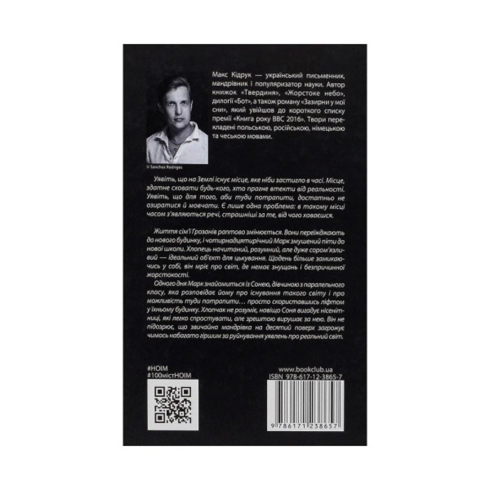 Макс Кідрук - український письменник, мандрівник і популяризатор науки. Автор книжок «Твердиня», «Жорстоке небо», дилогії «Бот», а також роману «Зазирни у мої сни», який увійшов до короткого списку премії «Книга року ВВС 2016». Твори перекладені польською, російською, німецькою та чеською мовами.