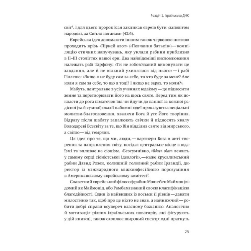 Аві Йоріш пояснює, як працює специфічна ізраїльська культура інновацій, у підґрунті якої – релігійне переконання, що добрі євреї мають направляти світ, tikkun olam. У сучасній інтерпретації ці слова давньої молитви означають шукати рішення для складних проблем у медицині, рятувати довкілля і зберігати активну громадянську позицію. Для героїв та героїнь цієї книжки — лікарів, науковців, агрономів, ботаніків, інженерів, юдеїв, християн і мусульман — «направляти світ» стало головною метою.
