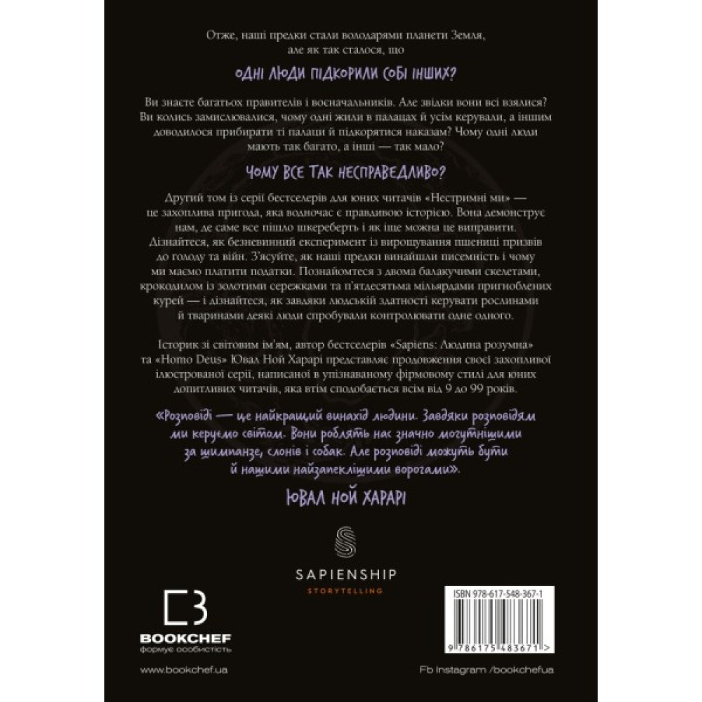 У другому томі серії ілюстрованих книжок «Нестримні ми», адресованих насамперед дітям, усесвітньо відомий історик і автор світових бестcелерів «Sapiens: Людина розумна» та «Homo Deus» Ювал Ной Харарі простежує розвиток людства після Аграрної революції, тобто після того, як людина почала вирощувати деякі рослини й одомашнила деяких тварин.