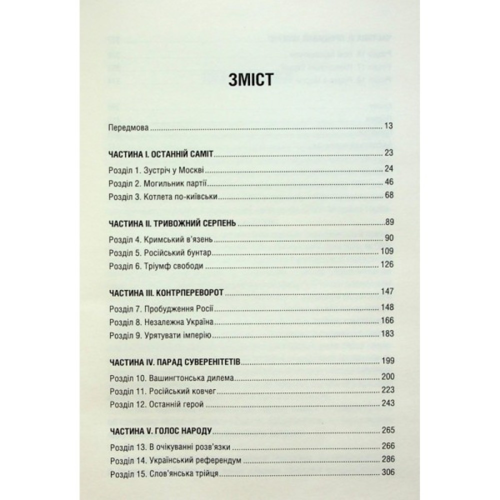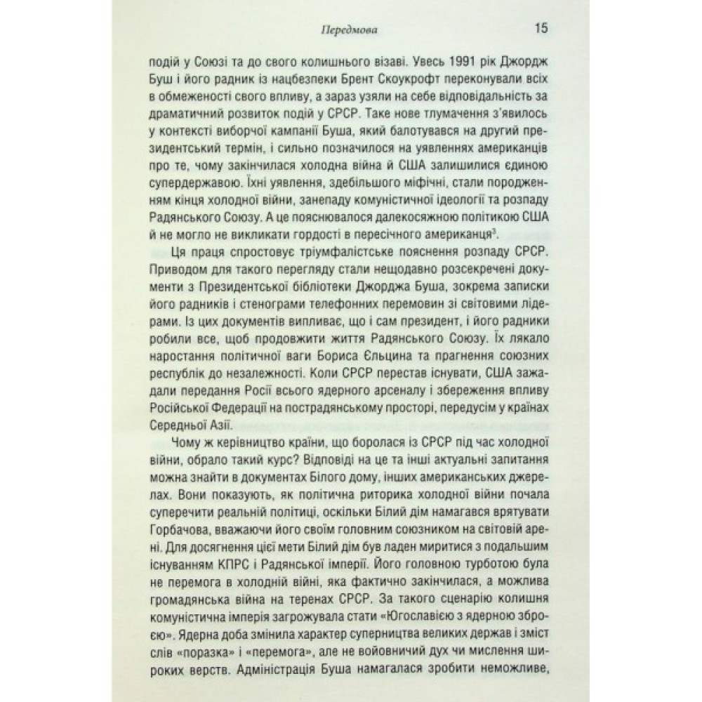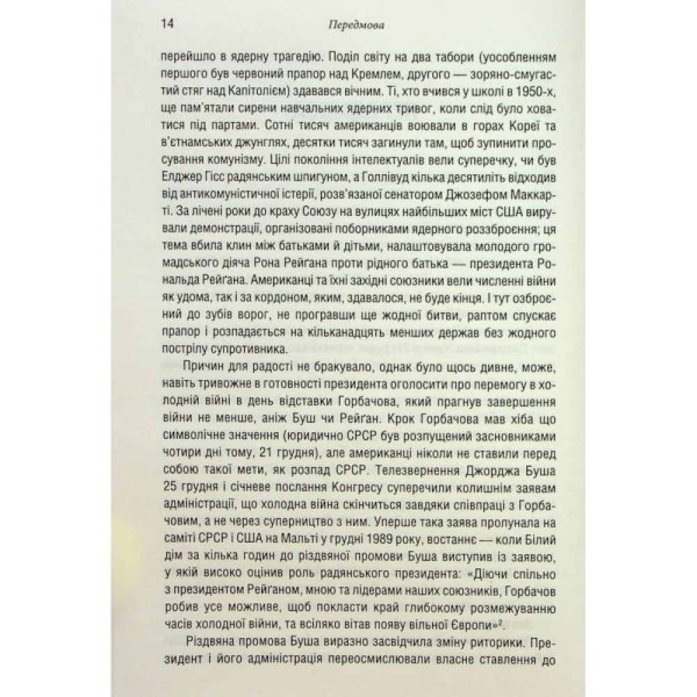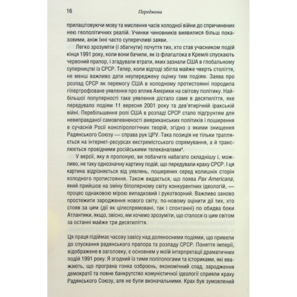 Автор упевнений: американська роль у розвалі Союзу була міфом, який роздували на догоду діячам американської зовнішньої політики та прихильникам імперського реваншу в Росії. Україна стала ключовим гравцем у драмі розвалу Союзу й не тільки здобула незалежність для себе, але й показала шлях до державності менш рішучим республікам, як-от Білорусь та Казахстан.