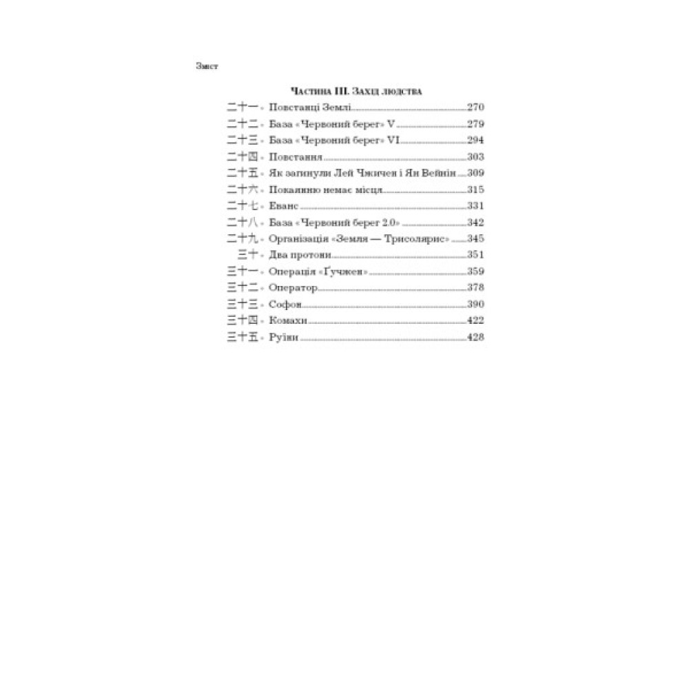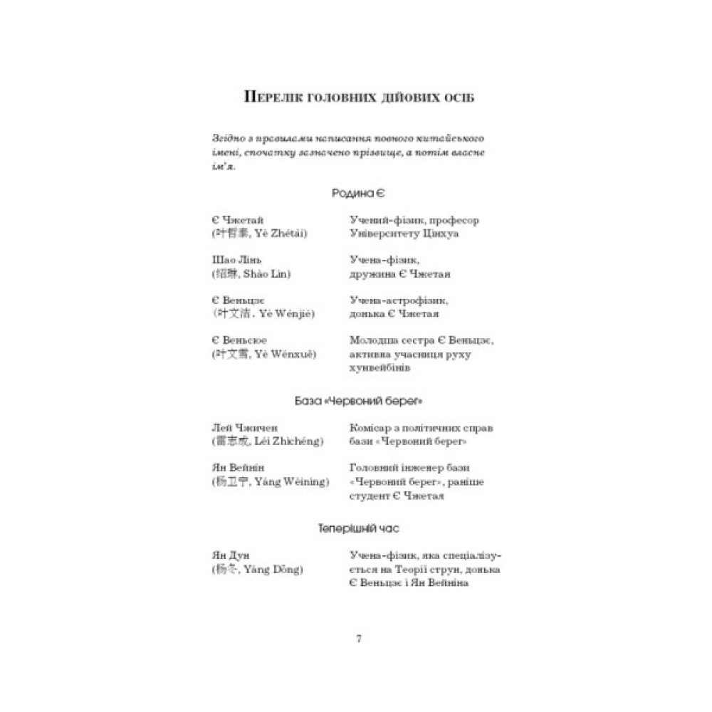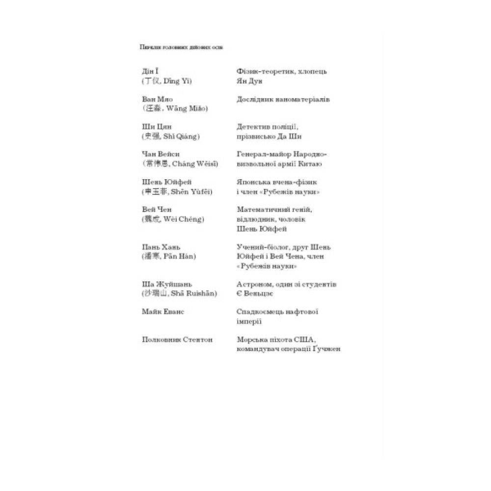 Всі ці події описані після короткого екскурсу в історію «культурної революції» у Китаї, звідки і починається історія однієї із героїнь роману. Фантастика від китайського автора в українському перекладі має продовження в наступних двох книгах трилогії.
