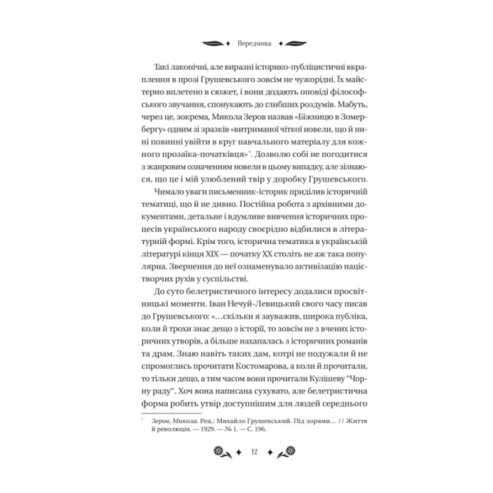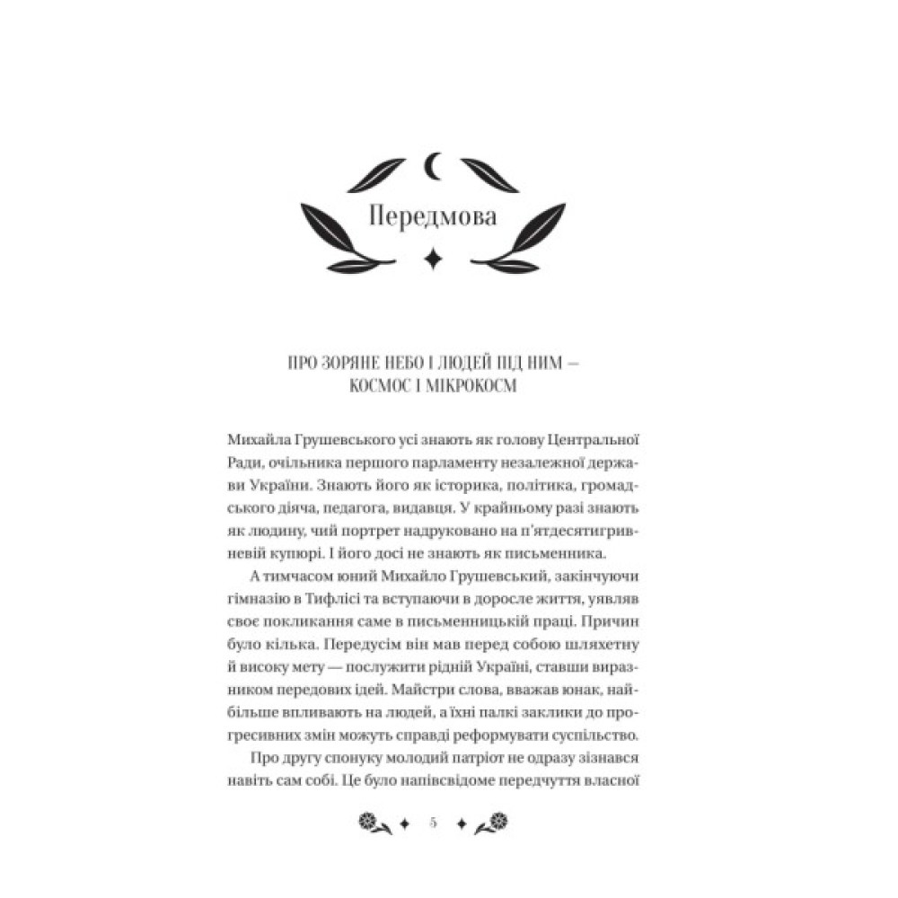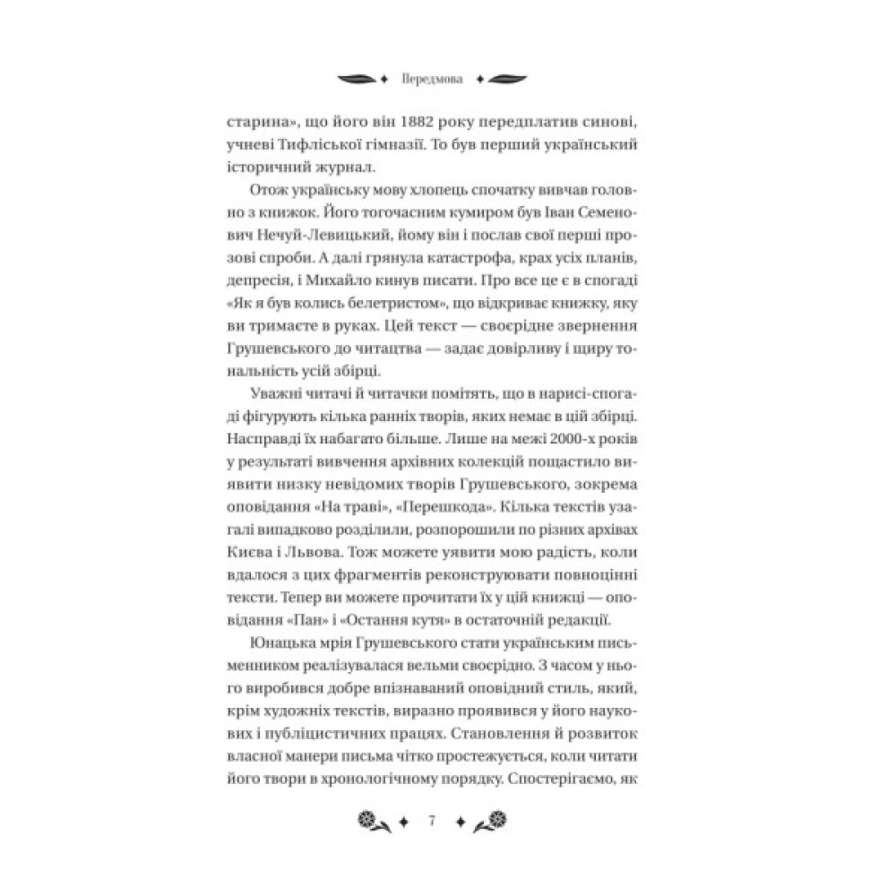 Грушевський залишив тисячу сторінок художньої спадщини. Тут зібрано шістнадцять його оповідань і мемуарний текст «Як я був колись белетристом». Ці твори засвідчують шлях автора в красному письменстві: від народника, котрий мріє про літературу як про громадську справу, до модерніста, який випускає на волю «зачинених дітей» своєї думки. Грушевський-письменник слідом за Кантом пропонує нам подивитися на зоряне небо над нами і на моральний закон усередині нас.