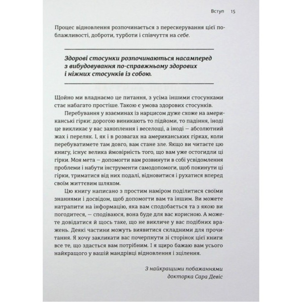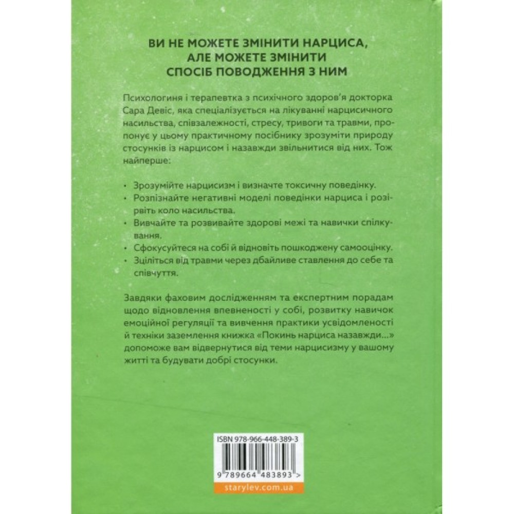 Ви не можете змінити нарциса, але можете змінити спосіб поводження з ним. Психологиня і терапевтка з психічного здоров’я докторка Сара Девіс, яка спеціалізується на лікуванні нарцисичного насильства, співзалежності, стресу, тривоги та травми, пропонує у цьому практичному посібнику зрозуміти природу стосунків із нарцисом і назавжди звільнитися від них.