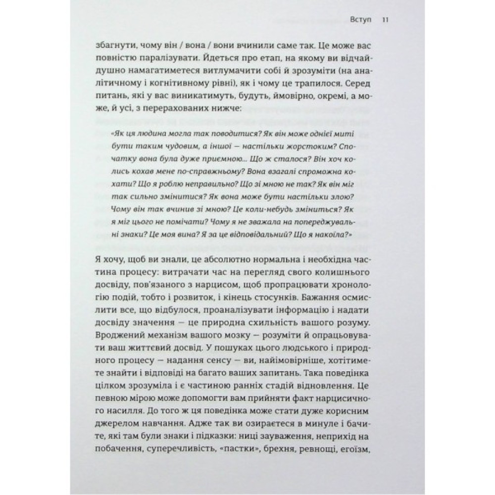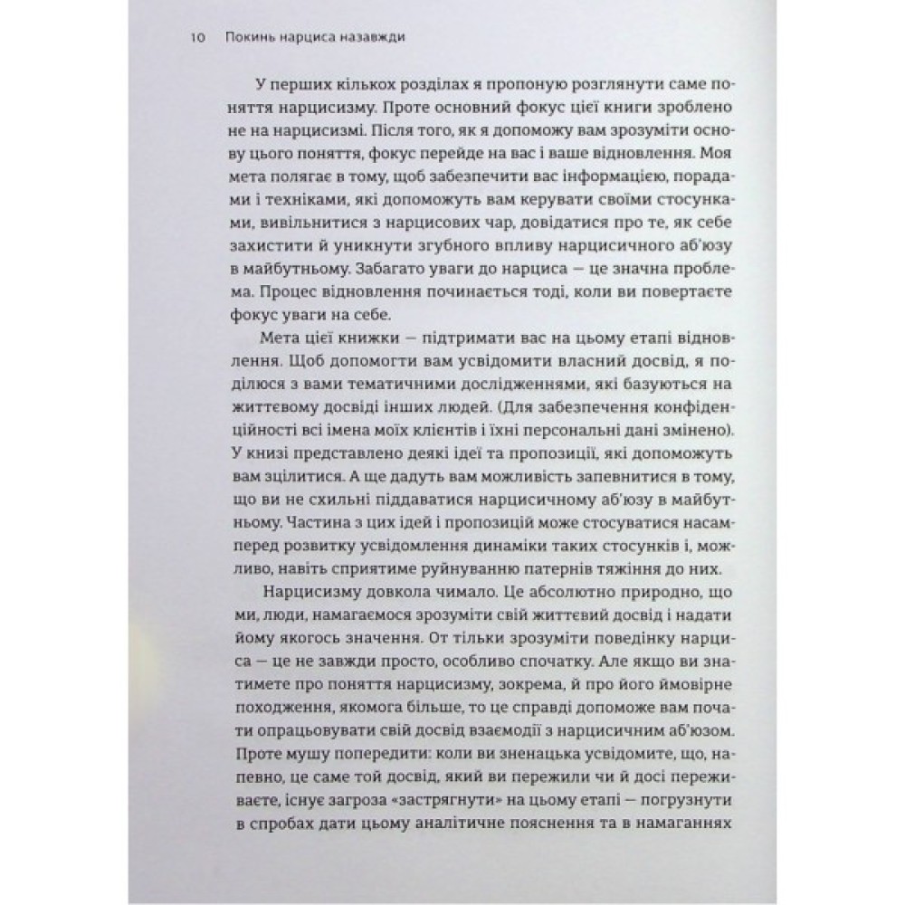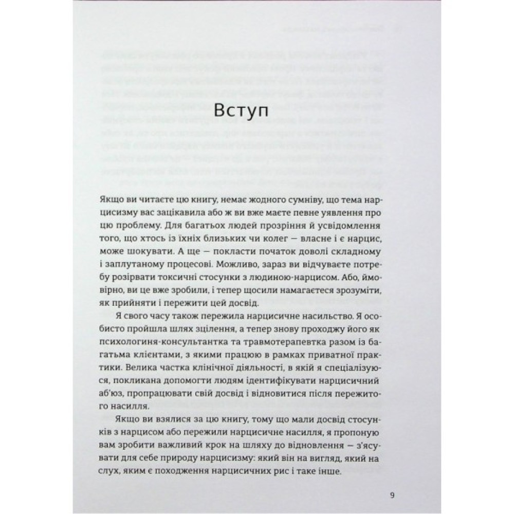 Легенда про самозакоханого грецького Нарциса та закохану в нього Ехо — стара як світ, але вона до нині про одержимість та сліпоту ілюзорного кохання та даремність подібних стосунків. Як розпізнати нарциса, розуміти його поведінку, склад розуму, задля особистого відновлення? Як розірвати токсичні стосунки з особою-нарцисом, а найголовніше, як зрозуміти, прийняти і пережити цей досвід?