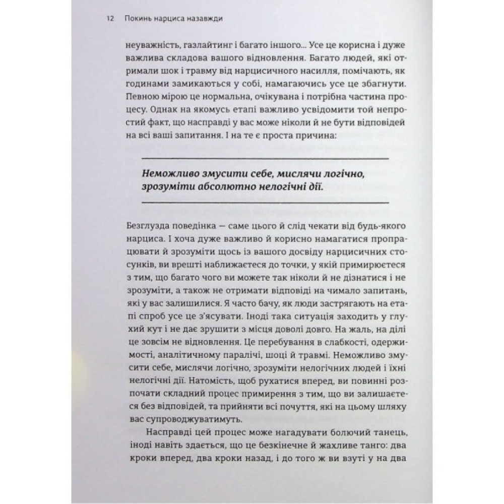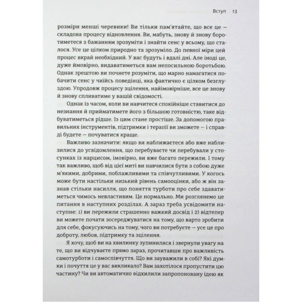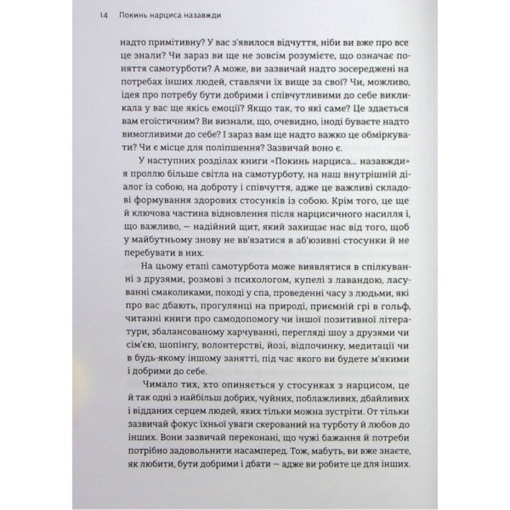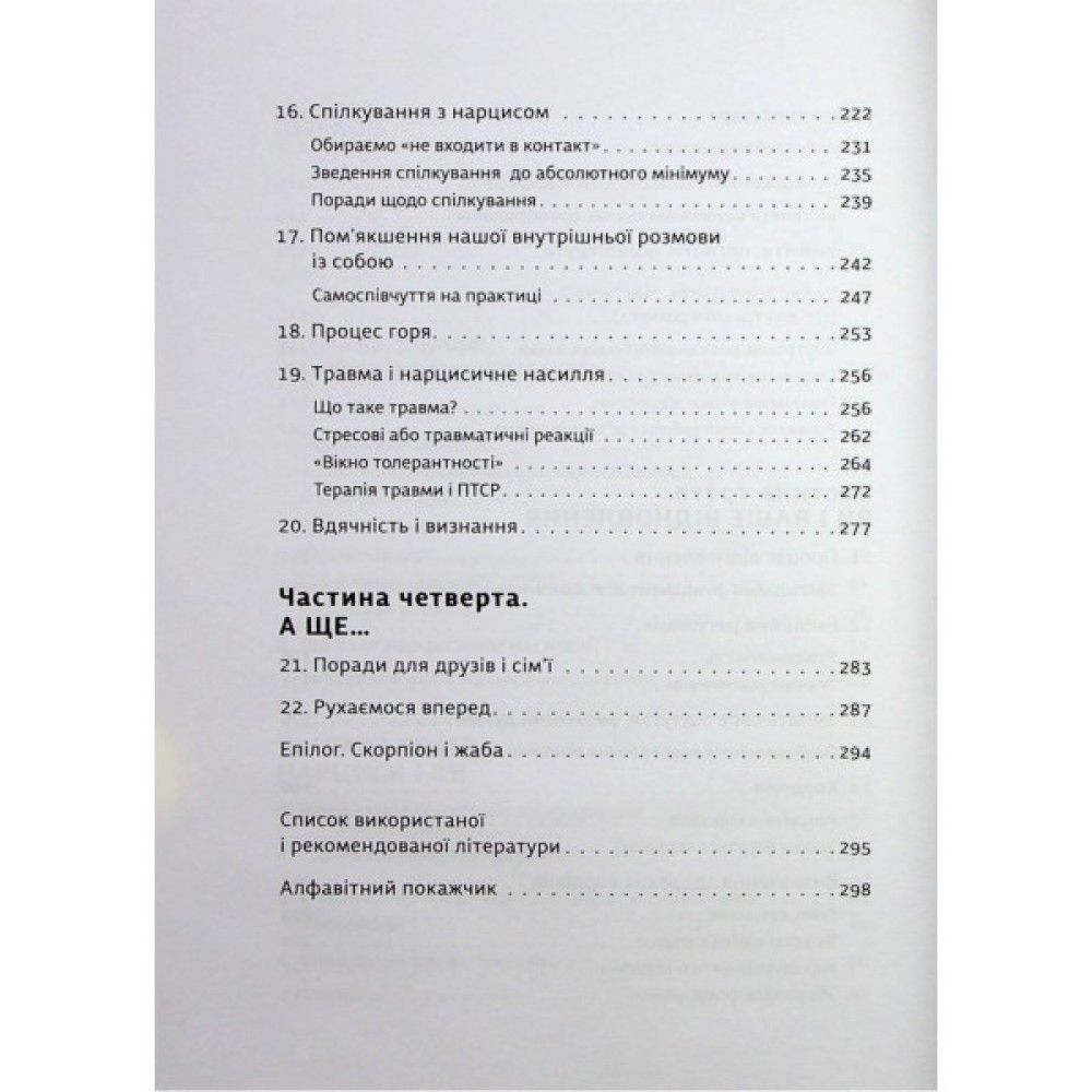 Легенда про самозакоханого грецького Нарциса та закохану в нього Ехо — стара як світ, але вона до нині про одержимість та сліпоту ілюзорного кохання та даремність подібних стосунків. Як розпізнати нарциса, розуміти його поведінку, склад розуму, задля особистого відновлення? Як розірвати токсичні стосунки з особою-нарцисом, а найголовніше, як зрозуміти, прийняти і пережити цей досвід?