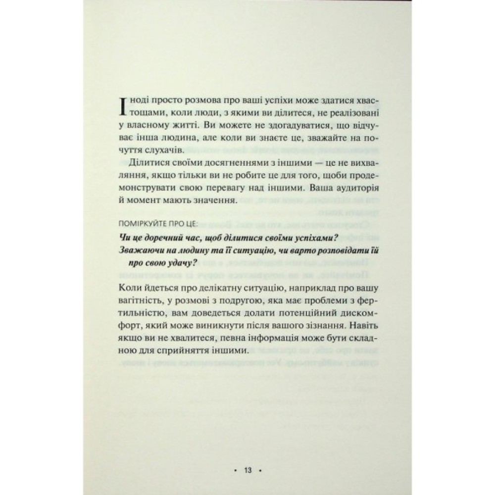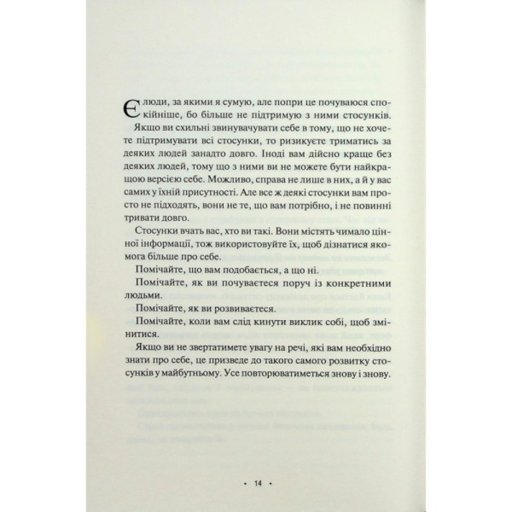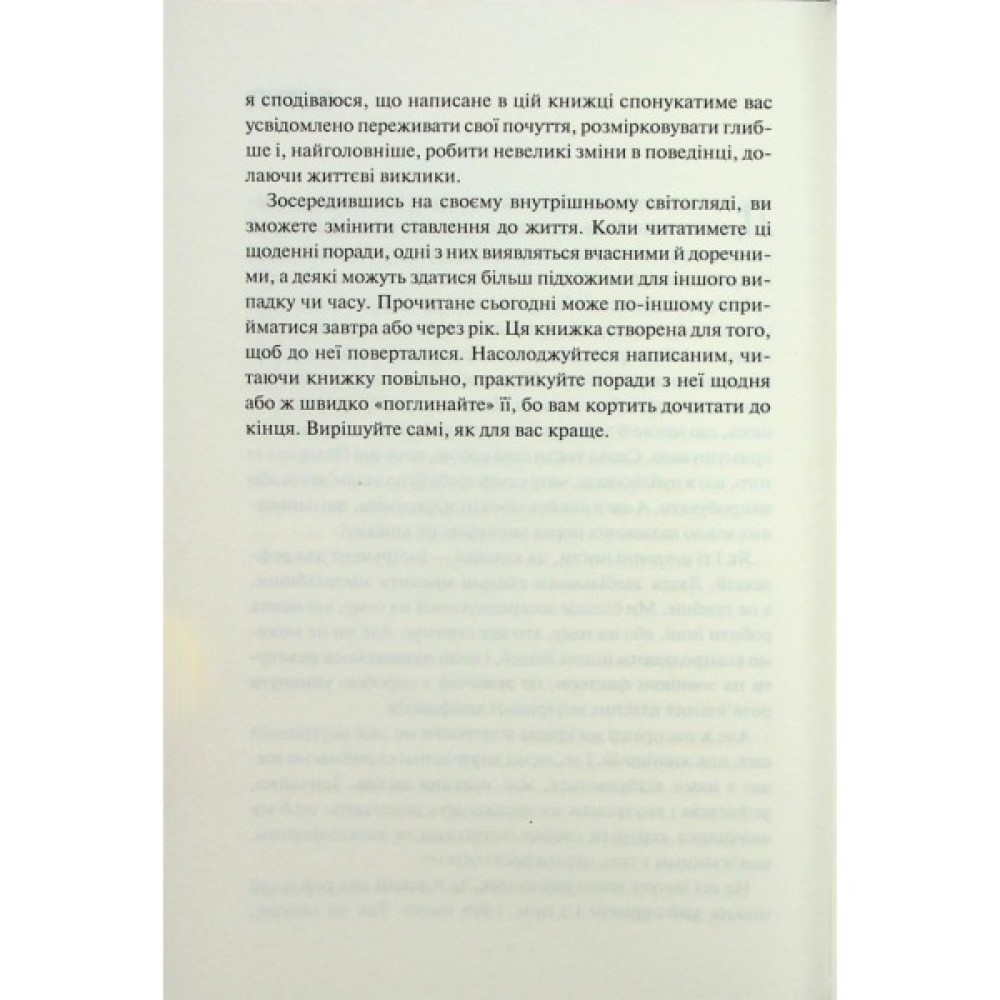 У цій збірці ідей для щоденного обмірковування психотерапевтка допомагає навчитися встановлювати кордони, висловлювати свої почуття з ясністю і чесністю, уникати зайвої драми та знаходити радість у простих моментах.