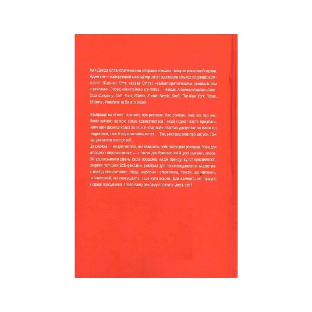 Ця книжка — не для читачів, які вважають себе знавцями реклами. Вона для молодих і перспективних — а також для бувалих, які й досі шукають способів удосконалити рівень своїх продажів. Імідж бренда, культ креативності, секрети успішної B2B-реклами, реклама для топ-менеджменту, маркетинг у період економічного спаду, шаблони та стереотипи, тексти, що чіпляють, та ілюстрації, які заманюють, і ще купа всього. Для кожного, хто працює у сфері просування. Тепер вашу рекламу побачить увесь світ!