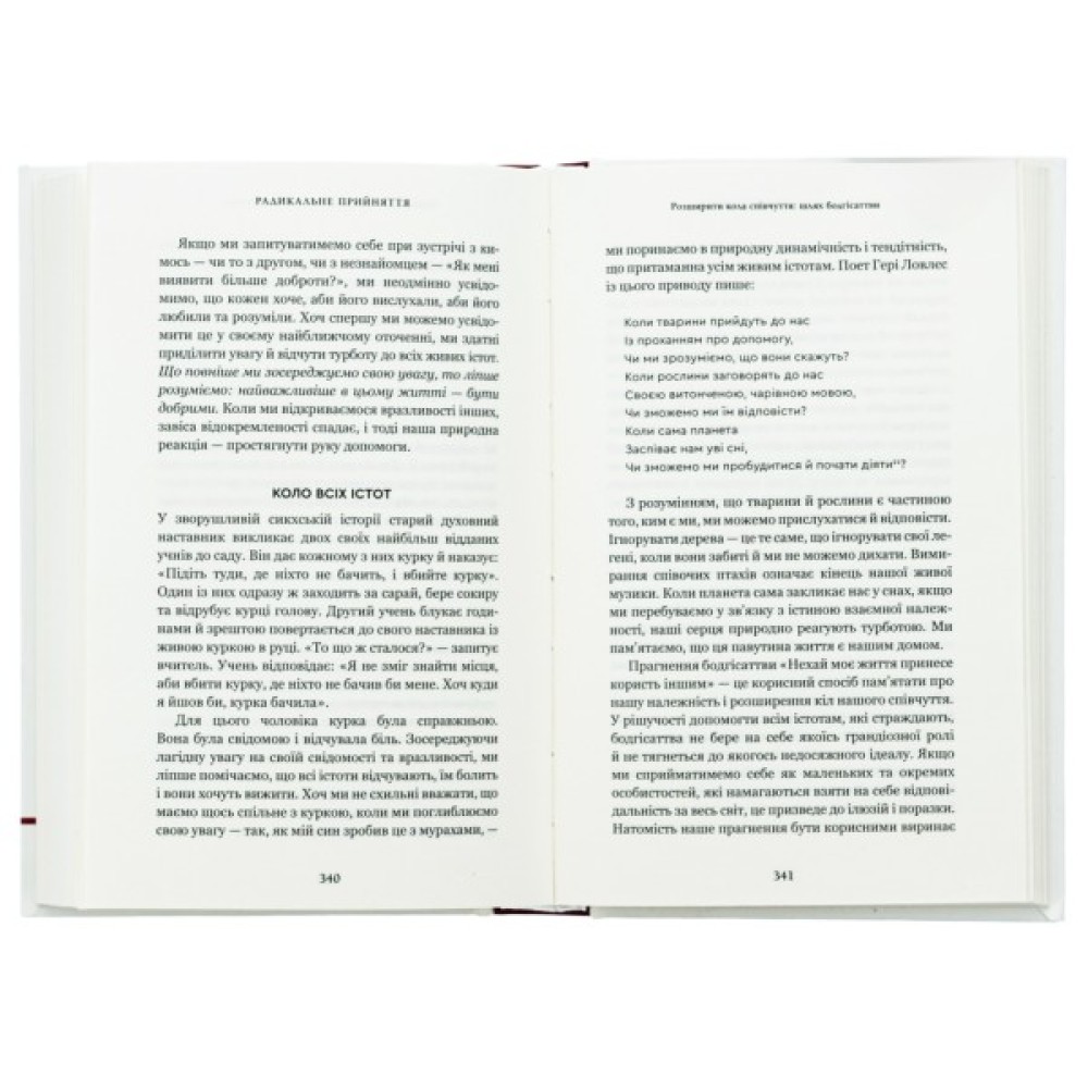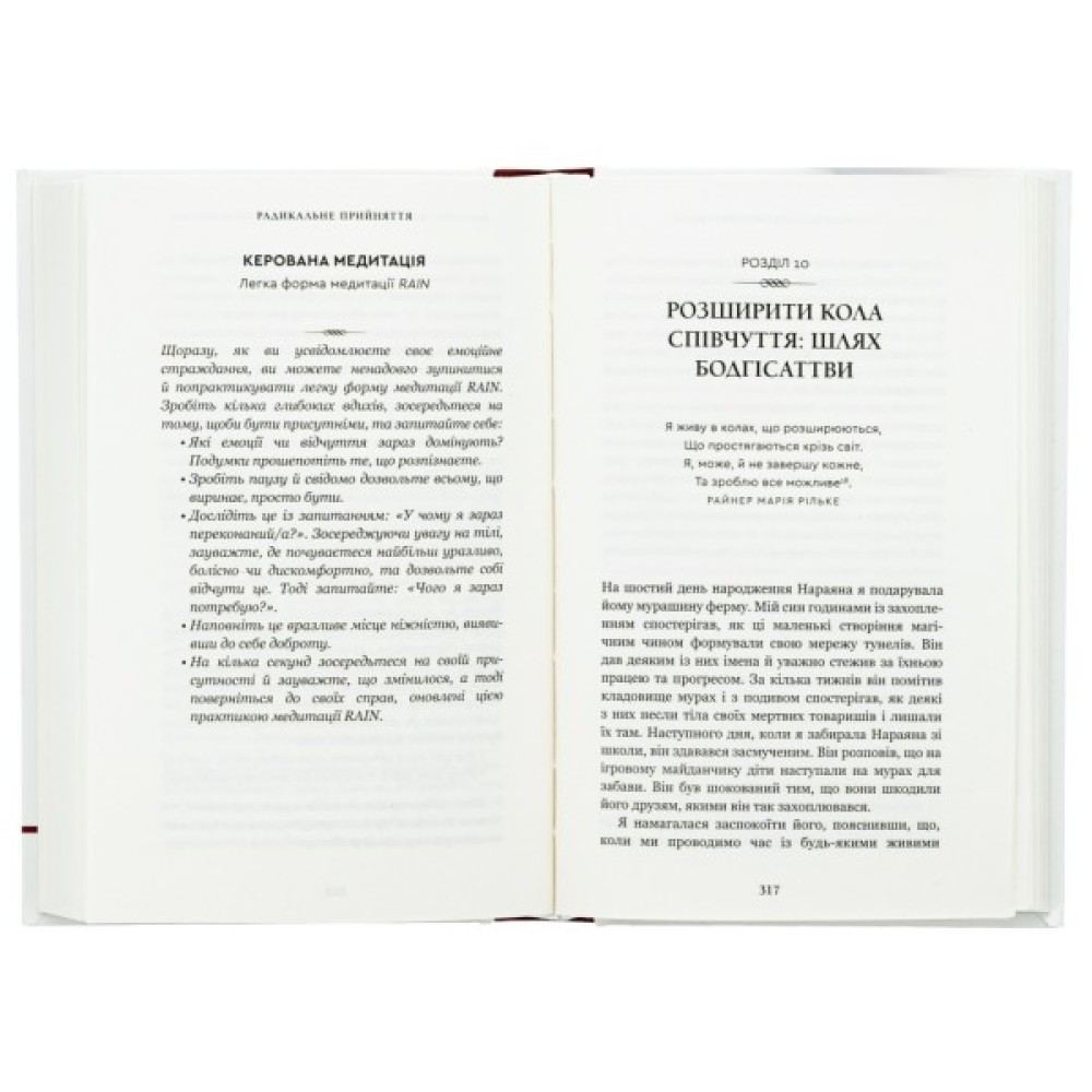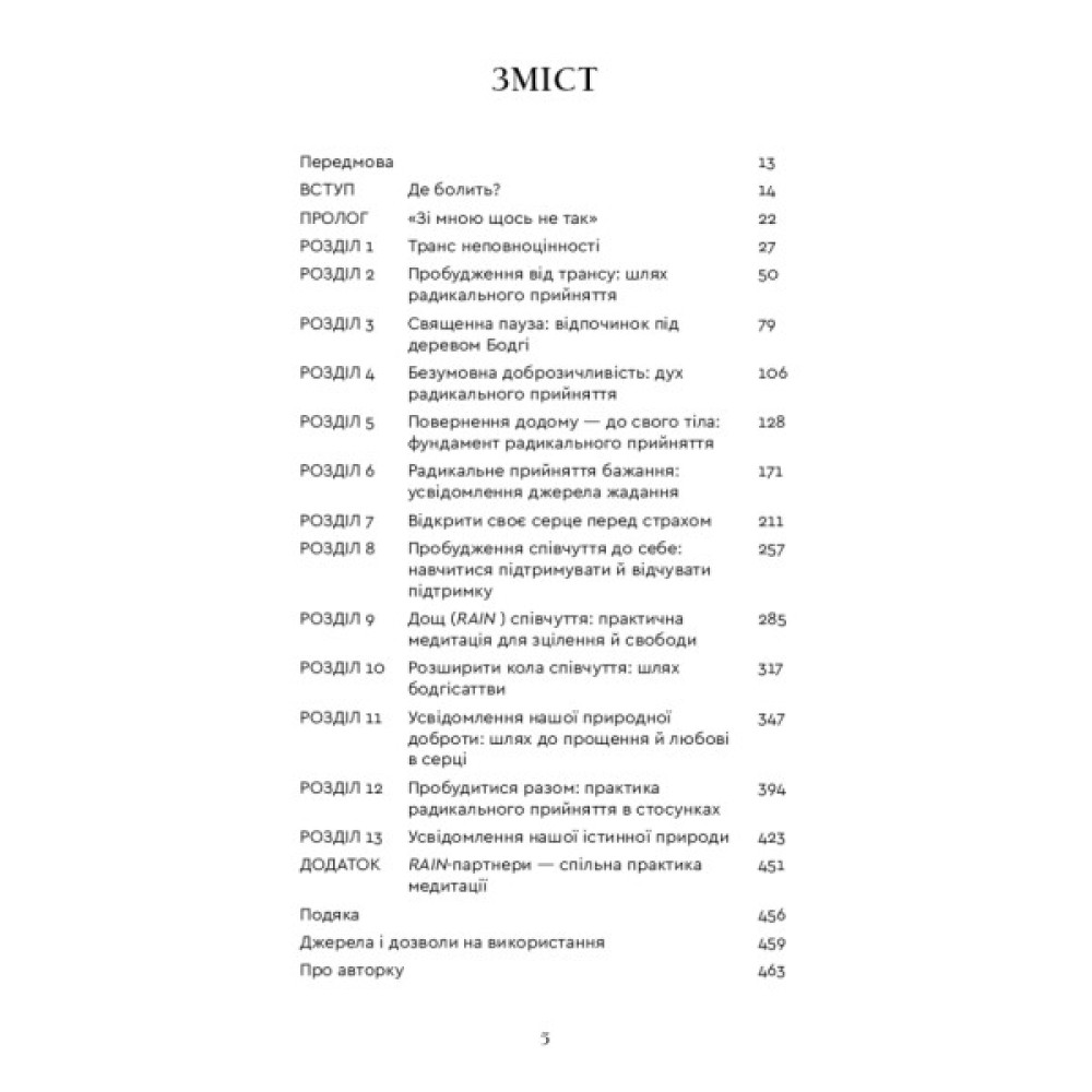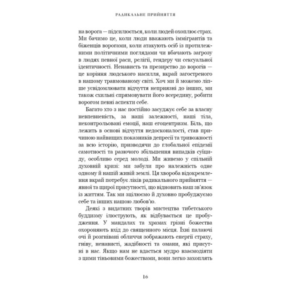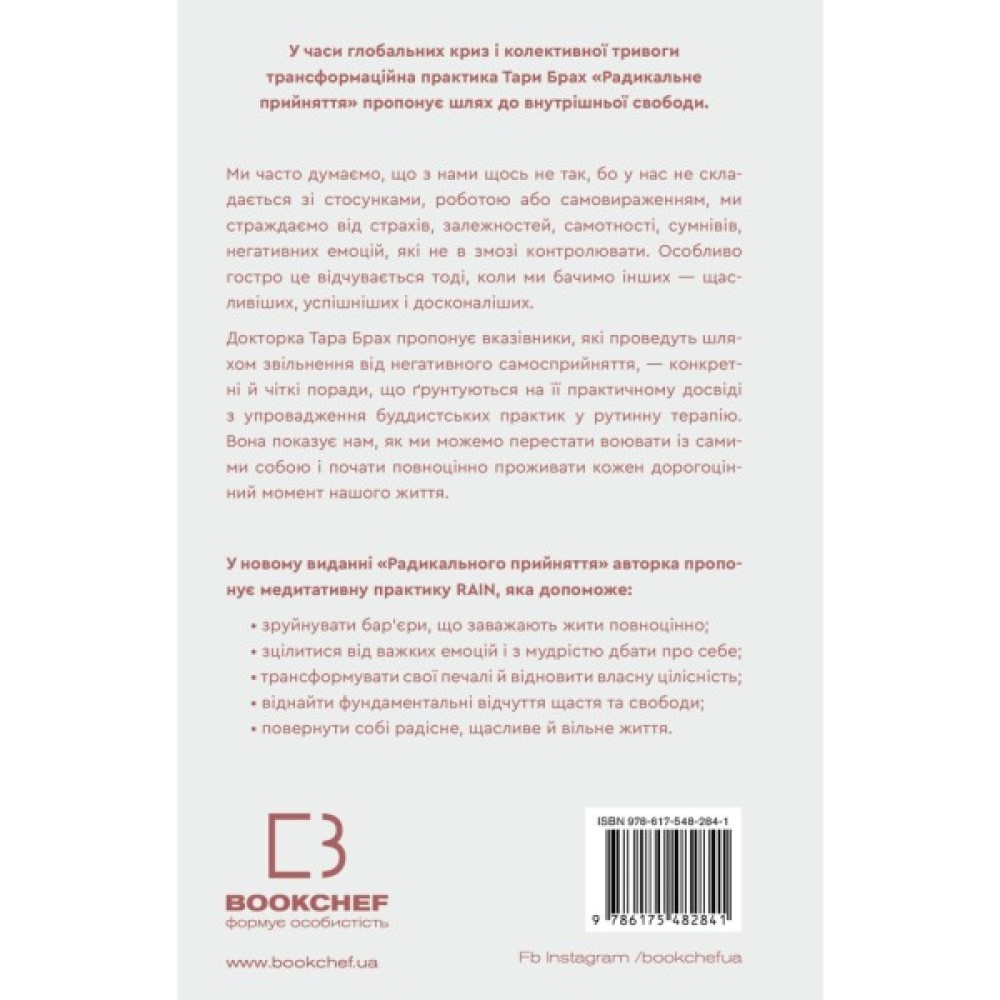 У нинішні часи глобальних криз і різкого зростання колективної тривоги трансформаційна практика Тари Брах «Радикальне прийняття» пропонує шлях до внутрішньої свободи. Ми часто думаємо, що з нами щось не так, бо маємо проблеми зі стосунками, самотністю, роботою, самовираженням, залежностями тощо. Особливо гостро це відчувається тоді, коли ми бачимо інших — щасливіших, успішніших і досконаліших. У цій книзі містяться вказівники, які проведуть шляхом звільнення від негативного самосприйняття, — конкретні й чіткі поради, що ґрунтуються на практичному досвіді докторки Брах з упровадження буддистських практик у рутинну терапію. Вона показує нам, як ми можемо перестати воювати із самими собою і почати повноцінно проживати кожен дорогоцінний момент нашого життя.