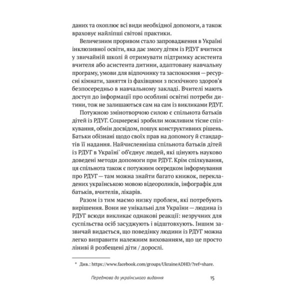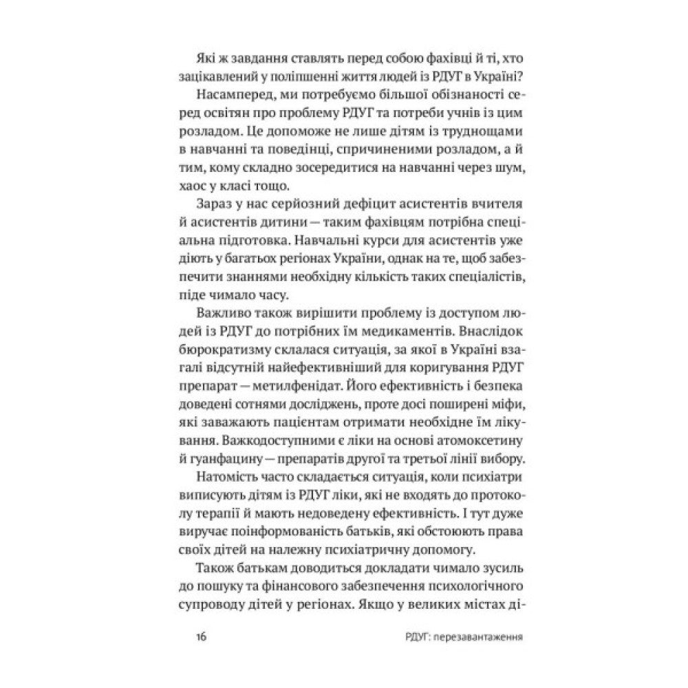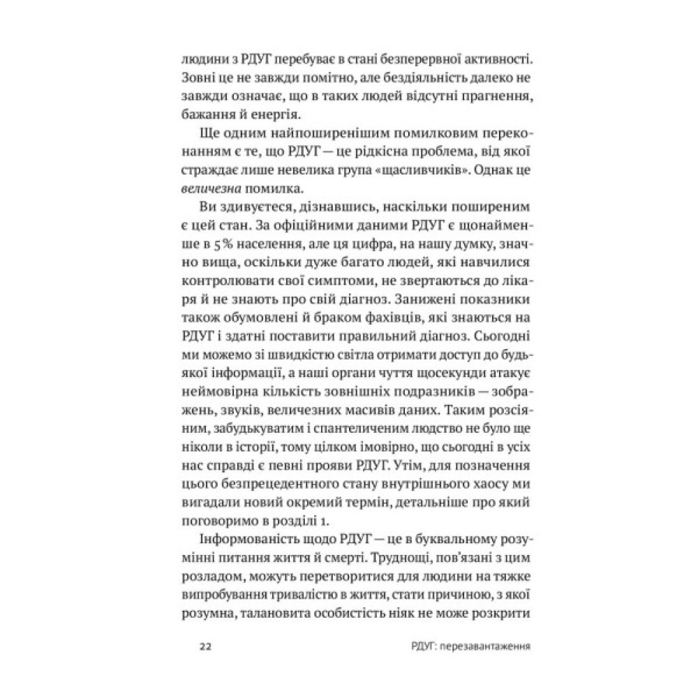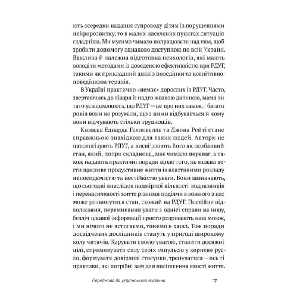Автори цієї книжки теж мають цей розлад і, окрім того, є сертифікованими психіатрами. У цій праці вони детально описують симптоми, причини та особливості РДУГ, розповідають про особливості роботи мозку та останні дослідження в нейробіології, показують, як організувати комфортне середовище людям із РДУГ, перетворити розлад на свою суперсилу та жити повноцінно.