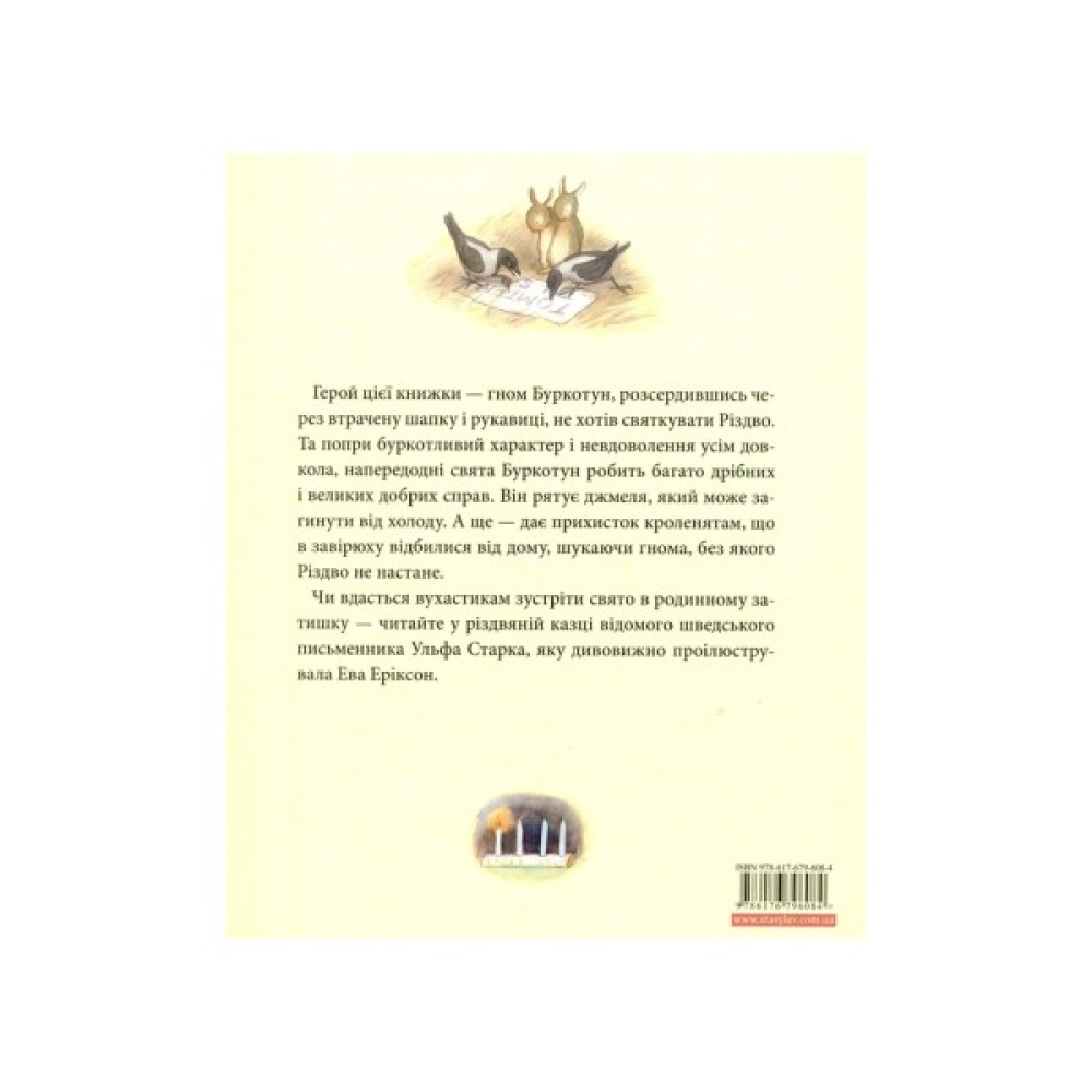 Герой цієї книжки – гном Буркотун, розсердившись через втрачену шапку і рукавиці, не хотів святкувати Різдво. Та попри буркотливий характер і невдоволення усім довкола напередодні свята Буркотун робить багато дрібних і великих добрих справ. Він рятує джмеля, який може загинути від холоду. А ще – дає прихисток кроленятам, що в завірюху відбилися від дому, шукаючи гнома, без якого Різдво не настане.