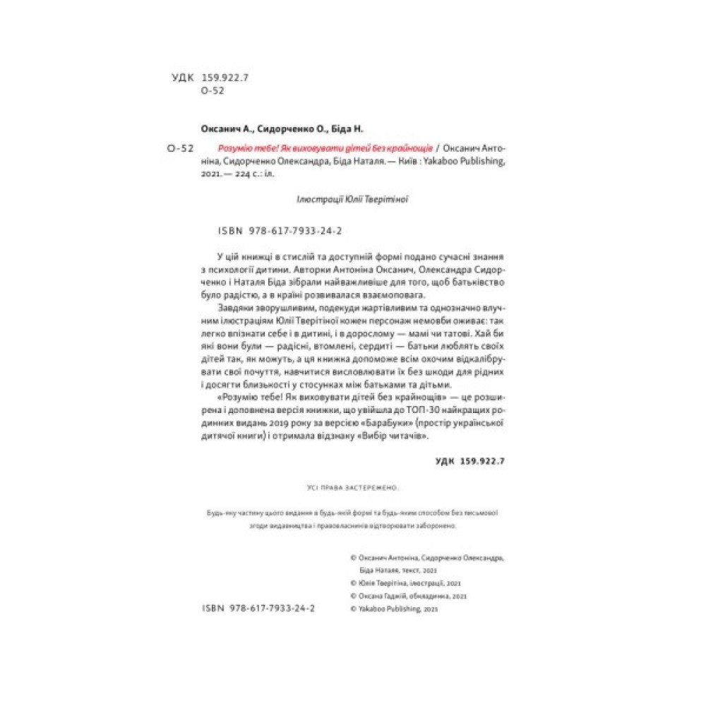 «Розумію тебе! Як виховувати дітей без крайнощів» — це розширена і доповнена версія книжки, що увійшла до ТОП-30 найкращих родинних видань 2019 року за версією «БараБуки» (простір української дитячої книги) і отримала відзнаку «Вибір читачів».
