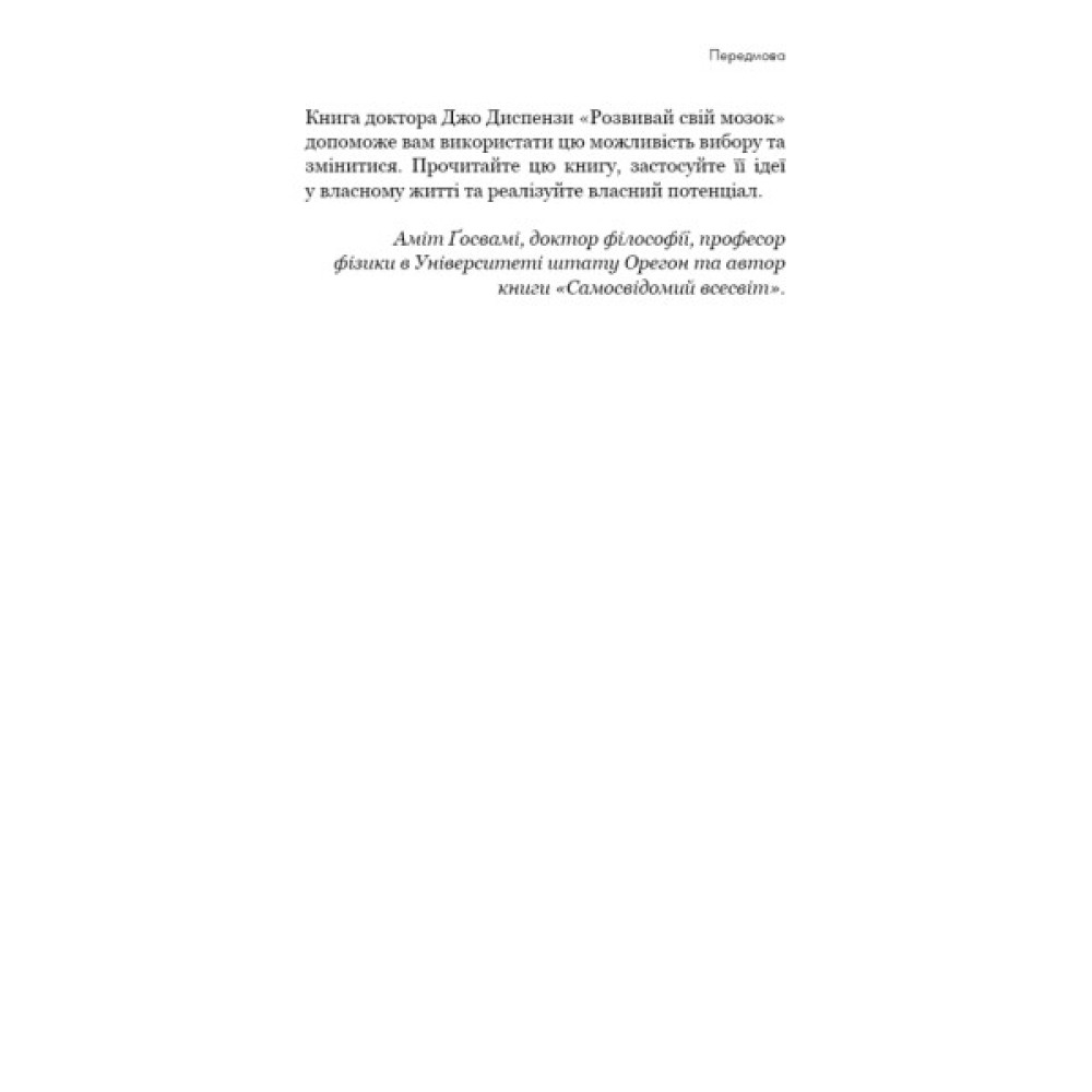 Доктор Джо Диспенза — професор нейрохімії і нейробіології, пропонує просунуту програму з налаштування мозку, тіла і життя. У книзі «Розвивай свій мозок» наведено зразки мисленнєвих тренувань через медитацію, зазначено, як користатися свідомим розумом разом із підсвідомим і як оновити операційну систему мозку. Від бажання змінитися до зміни себе нас відмежовує лише наша уява.